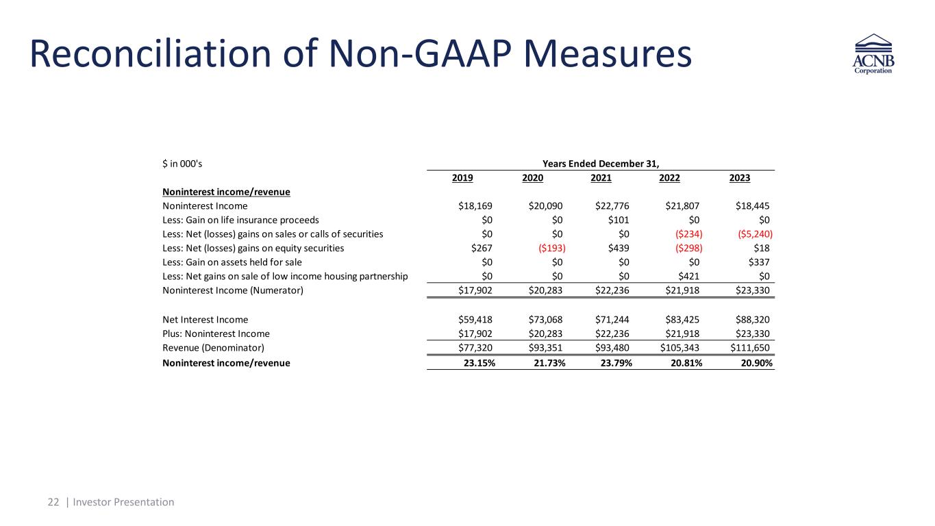 21 | Investor Presentation Reconciliation of Non-GAAP Measures 21 $ in 000's 3/31/2023 6/30/2023 9/30/2023 12/31/2023 3/31/2024 Efficiency Ratio Non-interest expense $16,282 $16,281 $16,336 $17,173 $17,662 Less: Intangible amortization $360 $360 $352 $352 $321 Less: Loss on MD Title Investment $0 $142 $0 $0 $0 Non-interest expense (numerator) $15,922 $15,779 $15,984 $16,821 $17,341 Net interest income $23,092 $21,990 $21,745 $21,493 $20,593 Plus: Total non-interest income $4,984 $6,194 $6,297 $970 $5,667 Less: Net (losses) gains on sales or calls of securities ($193) ($546) $0 ($4,501) $69 Less: Net (losses) gains on equity securities $20 ($15) ($27) $40 ($10) Less: Gain on assets held for sale $0 $323 $14 $0 $0 Total revenue (denominator) $28,249 $28,422 $28,055 $26,924 $26,201 Efficiency ratio 56.36% 55.52% 56.97% 62.48% 66.18% Noninterest income/revenue Noninterest Income $4,984 $6,194 $6,297 $970 $5,667 Less: Net (losses) gains on sales or calls of securities ($193) ($546) $0 ($4,501) $69 Less: Net (losses) gains on equity securities $20 ($15) ($27) $40 ($10) Less: Gain on assets held for sale $0 $323 $14 $0 $0 Noninterest Income (Numerator) $5,157 $6,432 $6,310 $5,431 $5,608 Net Interest Income $23,092 $21,990 $21,745 $21,493 $20,593 Plus: Noninterest Income $5,157 $6,432 $6,310 $5,431 $5,608 Revenue (Denominator) $28,249 $28,422 $28,055 $26,924 $26,201 Noninterest income/revenue 18.26% 22.63% 22.49% 20.17% 21.40% Three Months Ended,