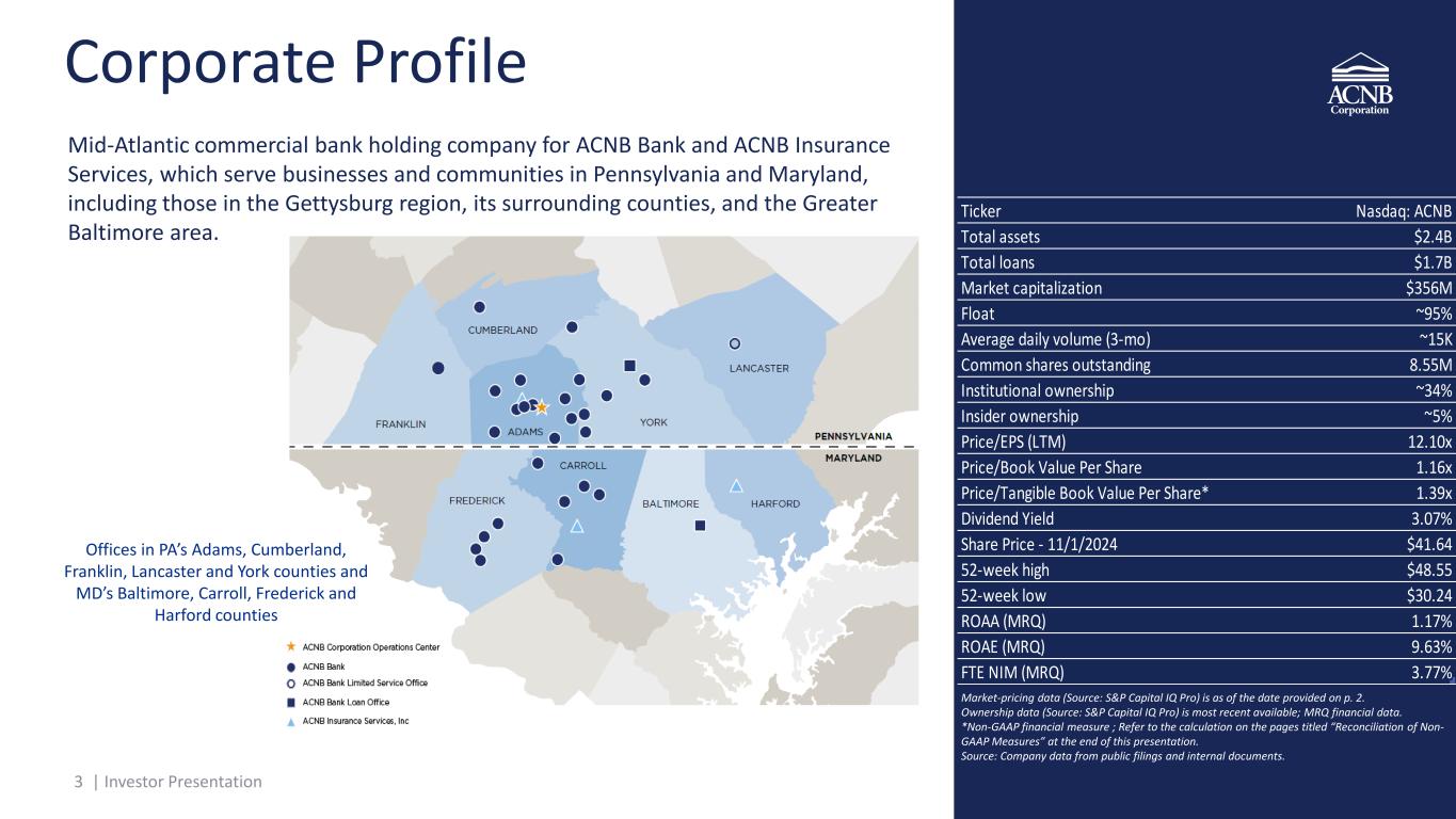 2 | Investor Presentation Important Information • ACNB Corporation (Nasdaq: ACNB) (“ACNB” or the “Corporation”) is the financial holding company for ACNB Bank (“ACNB Bank” or the “Bank”) and ACNB Insurance Services, Inc. (“ACNB Insurance Services,” “ACNB Insurance” or “Insurance Services”). • This presentation may contain forward-looking statements, including, but are not limited to, (a) projections or statements regarding future earnings, expenses, net interest income, other income, earnings or loss per share, asset mix and quality, growth prospects, capital structure, and other financial terms, (b) statements of plans and objectives of Management or the Board of Directors, and (c) statements of assumptions, such as economic conditions in the Corporation’s market areas. Such forward-looking statements can be identified by the use of forward-looking terminology such as “believes”, “expects”, “may”, “intends”, “will”, “should”, “anticipates”, or the negative of any of the foregoing or other variations thereon or comparable terminology, or by discussion of strategy. Forward-looking statements are subject to certain risks and uncertainties. Such risks, uncertainties and other factors that could cause actual results and experience to differ from those projected include, but are not limited to, the following: short-term and long-term effects of inflation and rising costs on the Corporation, customers and the economy; legislative and regulatory changes; banking system instability caused by failures and continuing financial instability of certain banks which may adversely impact the Corporation and its securities and loan values, deposit stability, capital adequacy, financial condition, operations, liquidity, and results of operations; effects of governmental and fiscal policies, as well as legislative and regulatory changes; effects of new laws and regulations (including laws and regulations concerning taxes, banking, securities and insurance) and their application with which the Corporation and its subsidiaries must comply; impacts of the capital and liquidity requirements of the Basel III standards and any similar standards; effects of changes in accounting policies and practices, as may be adopted by the regulatory agencies, as well as the Financial Accounting Standards Board and other accounting standard setters; ineffectiveness of the business strategy due to changes in current or future market conditions; future actions or inactions of the United States government, including the effects of short-term and long-term federal budget and tax negotiations and a failure to increase the government debt limit or a prolonged shutdown of the federal government; effects of economic conditions particularly with regard to the negative impact of any pandemics, epidemics or health-related crises and the responses thereto on the operations of the Corporation and current customers, specifically the effect of the economy on loan customers' ability to repay loans; effects of competition, and of changes in laws and regulations on competition, including industry consolidation and development of competing financial products and services; inflation, securities market and monetary fluctuations; risks of changes in interest rates on the level and composition of deposits, loan demand, and the values of loan collateral, securities, and interest rate protection agreements, as well as interest rate risks; difficulties in acquisitions and integrating and operating acquired business operations, including information technology difficulties; challenges in establishing and maintaining operations in new markets; effects of technology changes; effects of general economic conditions and more specifically in the Corporation's market areas; failure of assumptions underlying the establishment of reserves for credit losses and estimations of values of collateral and various financial assets and liabilities; acts of war or terrorism or geopolitical instability; disruption of credit and equity markets; ability to manage current levels of impaired assets; loss of certain key officers; ability to maintain the value and image of the Corporation's brand and protect the Corporation's intellectual property rights; continued relationships with major customers; and, potential impacts to the Corporation from continually evolving cybersecurity and other technological risks and attacks, including additional costs, reputational damage, regulatory penalties, and financial losses. We caution readers not to place undue reliance on these forward-looking statements. They only reflect Management’s analysis as of the filing date of the Form 8-K that this presentation was furnished to the Securities and Exchange Commission (“SEC”). Some of the factors that could cause the Corporation’s actual results to differ materially from those described in the forward-looking statements can be found in the Corporation’s most recent Annual Report on Form 10-K and most-recent Quarterly Report on Form 10-Q, which have been filed with the SEC and are available at investor.acnb.com. The Corporation does not revise or update these forward-looking statements to reflect events or changed circumstances. Please carefully review the risk factors described in other documents the Corporation files from time to time with the SEC, including the Annual Reports on Form 10-K, Quarterly Reports on Form 10-Q. Please also carefully review any Current Reports on Form 8- K filed by the Corporation with the Securities and Exchange Commission. • All ACNB Corporation, ACNB Bank and ACNB Insurance Services financial data referenced herein is provided by the Corporation. ACNB data for the most recent quarter (“MRQ”) and last twelve month (“LTM”) is for periods ending September 30, 2024. • All market-pricing data (Source: S&P Capital IQ Pro) is as of November 1, 2024. • To the extent that Corporation or B