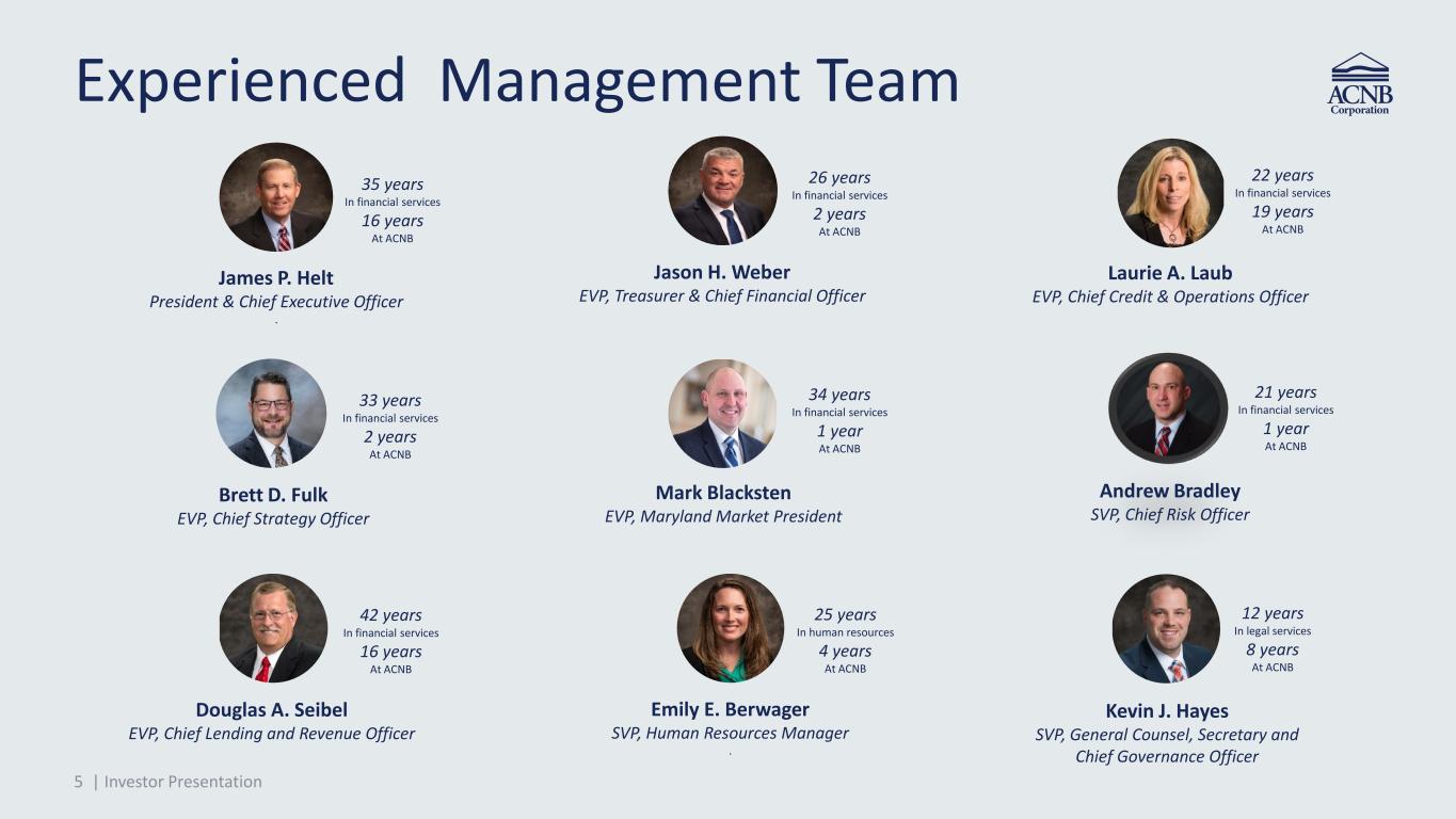 4 | Investor Presentation Experienced Management Team • Proven management team with many years of experience • Approximately 250 years of combined experience Commercially Focused Loan Portfolio • Commercial loans/total loans* ratio of approximately 70% • Average commercial loan yield of 5.62%* • Attractive PA and MD growth markets Stable and Low-Cost Deposit Base • 165+ year-old bank with loyal customer base and leading market share in its core PA markets • Strong presence in affluent and dynamic MD markets • 0.92% cost of interest bearing deposits • Non-interest bearing demand deposits are approximately 26% of the deposit portfolio Commitment to Noninterest Income to Diversify Revenue • ~24.5% noninterest income to revenues†† driven by insurance services and wealth management • ~$695 million in assets under management or administration in wealth management Focus on Expense management to Create Efficiencies and Support Investments into Improving Customer Experience • ~18% reduction in net branch count since December 31, 2020 to 27 locations • Undertaking enterprise modernization and digital transformation Strong Profitability in Tough Operating Environment • 1.17% return on average assets (“ROAA”) and 9.63% return on average equity (“ROAE”) Actively Managing Strong Capital Position • Strong capital position provides flexibility to return capital to shareholders and fund prudent growth of the bank • 10.74% tangible common equity/tangible assets†† and regulatory ratios well above internal minimums • Recently announced strategic acquisition of Traditions Bancorp, Inc. Stable Asset Quality • 0.39% NPLs/loans • 0.01% NCOs/avg. loans • 1.03% allowance/loans and 262% allowance/NPLs Attractive Entry Point for ACNB Stock • Price to tangible book value per share†† of 139% • Dividend yield** of 3.1% Investment Highlights * C&I, CRE, multifamily, farm and construction and development loans as percentage of total loans. Yield is on a fully taxable equivalent. †† Non-GAAP financial measure ; Refer to the calculation on the pages titled “Reconciliation of Non-GAAP Measures” at the end of this presentation. ** The Corporation’s common stock dividend declared in the MRQ, annualized, as a percentage of ACNB Corporation’s closing share as of date provided on p. 2. Financial data as of or for the three months ending 9/30/24; Market-pricing data (Source: S&P Capital IQ Pro) is as of the date provided on p. 2. Source: Company data from public filings and internal documents.