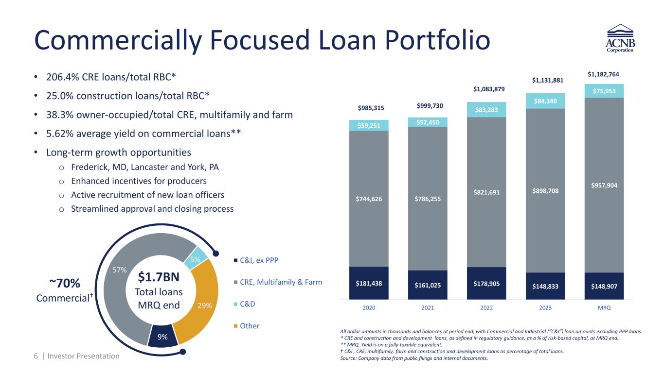 5 | Investor Presentation Experienced Management Team James P. Helt President & Chief Executive Officer . 35 years In financial services 16 years At ACNB Mark Blacksten EVP, Maryland Market President 34 years In financial services 1 year At ACNB Brett D. Fulk EVP, Chief Strategy Officer 33 years In financial services 2 years At ACNB Laurie A. Laub EVP, Chief Credit & Operations Officer 22 years In financial services 19 years At ACNB Douglas A. Seibel EVP, Chief Lending and Revenue Officer 42 years In financial services 16 years At ACNB Jason H. Weber EVP, Treasurer & Chief Financial Officer 26 years In financial services 2 years At ACNB Kevin J. Hayes SVP, General Counsel, Secretary and Chief Governance Officer 12 years In legal services 8 years At ACNB Emily E. Berwager SVP, Human Resources Manager . 25 years In human resources 4 years At ACNB 21 years In financial services 1 year At ACNB Andrew Bradley SVP, Chief Risk Officer