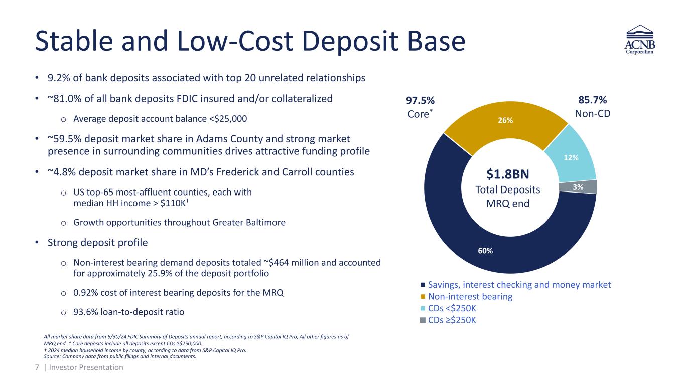 6 | Investor Presentation ~70% Commercial† Commercially Focused Loan Portfolio • 206.4% CRE loans/total RBC* • 25.0% construction loans/total RBC* • 38.3% owner-occupied/total CRE, multifamily and farm • 5.62% average yield on commercial loans** • Long-term growth opportunities o Frederick, MD, Lancaster and York, PA o Enhanced incentives for producers o Active recruitment of new loan officers o Streamlined approval and closing process All dollar amounts in thousands and balances at period end, with Commercial and Industrial (“C&I”) loan amounts excluding PPP loans. * CRE and construction and development loans, as defined in regulatory guidance, as a % of risk-based capital, at MRQ end. ** MRQ. Yield is on a fully taxable equivalent. † C&I , CRE, multifamily, farm and construction and development loans as percentage of total loans. $1.7BN Total loans MRQ end Source: Company data from public filings and internal documents. $181,438 $161,025 $178,905 $148,833 $148,907 $744,626 $786,255 $821,691 $898,708 $957,904 $59,251 $52,450 $83,283 $84,340 $75,953 $985,315 $999,730 $1,083,879 $1,131,881 $1,182,764 2020 2021 2022 2023 MRQ 9% 57% 5% 29% C&I, ex PPP CRE, Multifamily & Farm C&D Other