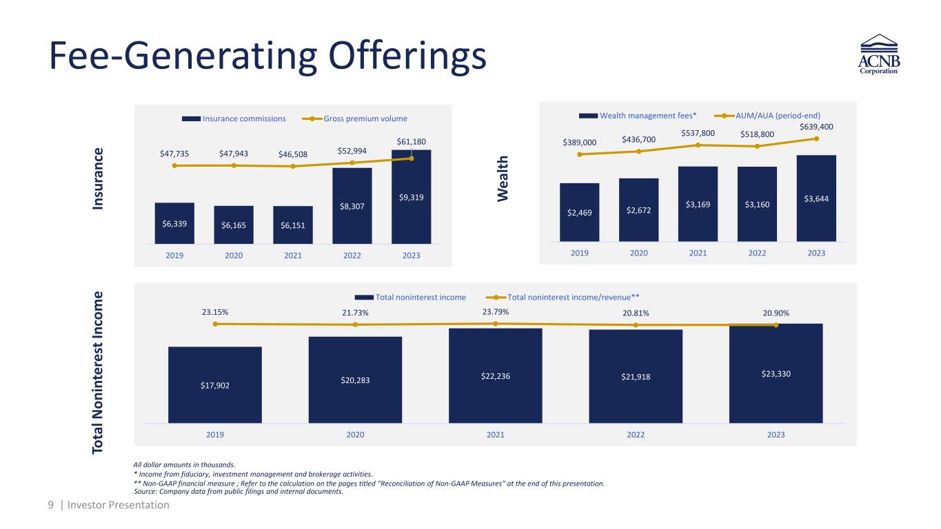 8 | Investor Presentation Commitment to Noninterest Income to Diversify Revenue • Linked quarter increase driven primarily by increases in wealth management income driven by higher estate income, other income driven by annual check ordering incentives and gains from mortgage loans held for sale driven by higher volume of mortgages sold • Year-over-year increase driven primarily by increases in wealth management driven primarily by portfolio market appreciation, estate income and new business generation, Insurance commissions driven primarily by growth in commissions on policy renewals and new business and gains from mortgage loans held for sale driven by higher volume of mortgages sold $6.8MN Noninterest income MRQ Source: Company data from public filings and internal documents. 1 .6 % $000s 3Q23 2Q24 3Q24 Insurance commissions $2,629 $2,747 $2,787 Service charges on deposits $1,000 $1,021 $1,048 Wealth management $953 $1,069 $1,188 Gain from mortgage loans held for sale $0 $34 $112 Earnings on investment in bank-owned life insurance $473 $493 $503 ATM debit card transactions $845 $841 $828 Other $397 $222 $367 Total noninterest income $6,297 $6,427 $6,833