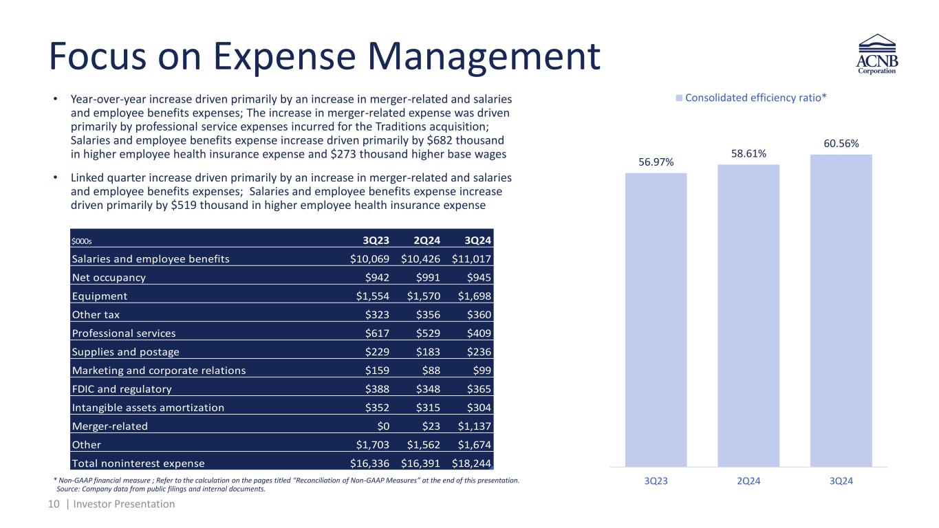 2 | Investor Presentation Important Information • ACNB Corporation (Nasdaq: ACNB) (“ACNB” or the “Corporation”) is the financial holding company for ACNB Bank (“ACNB Bank” or the “Bank”) and ACNB Insurance Services, Inc. (“ACNB Insurance Services,” “ACNB Insurance” or “Insurance Services”). • This presentation may contain forward-looking statements, including, but are not limited to, (a) projections or statements regarding future earnings, expenses, net interest income, other income, earnings or loss per share, asset mix and quality, growth prospects, capital structure, and other financial terms, (b) statements of plans and objectives of Management or the Board of Directors, and (c) statements of assumptions, such as economic conditions in the Corporation’s market areas. Such forward-looking statements can be identified by the use of forward-looking terminology such as “believes”, “expects”, “may”, “intends”, “will”, “should”, “anticipates”, or the negative of any of the foregoing or other variations thereon or comparable terminology, or by discussion of strategy. Forward-looking statements are subject to certain risks and uncertainties. Such risks, uncertainties and other factors that could cause actual results and experience to differ from those projected include, but are not limited to, the following: short-term and long-term effects of inflation and rising costs on the Corporation, customers and the economy; legislative and regulatory changes; banking system instability caused by failures and continuing financial instability of certain banks which may adversely impact the Corporation and its securities and loan values, deposit stability, capital adequacy, financial condition, operations, liquidity, and results of operations; effects of governmental and fiscal policies, as well as legislative and regulatory changes; effects of new laws and regulations (including laws and regulations concerning taxes, banking, securities and insurance) and their application with which the Corporation and its subsidiaries must comply; impacts of the capital and liquidity requirements of the Basel III standards and any similar standards; effects of changes in accounting policies and practices, as may be adopted by the regulatory agencies, as well as the Financial Accounting Standards Board and other accounting standard setters; ineffectiveness of the business strategy due to changes in current or future market conditions; future actions or inactions of the United States government, including the effects of short-term and long-term federal budget and tax negotiations and a failure to increase the government debt limit or a prolonged shutdown of the federal government; effects of economic conditions particularly with regard to the negative impact of any pandemics, epidemics or health-related crises and the responses thereto on the operations of the Corporation and current customers, specifically the effect of the economy on loan customers' ability to repay loans; effects of competition, and of changes in laws and regulations on competition, including industry consolidation and development of competing financial products and services; inflation, securities market and monetary fluctuations; risks of changes in interest rates on the level and composition of deposits, loan demand, and the values of loan collateral, securities, and interest rate protection agreements, as well as interest rate risks; difficulties in acquisitions and integrating and operating acquired business operations, including information technology difficulties; challenges in establishing and maintaining operations in new markets; effects of technology changes; effects of general economic conditions and more specifically in the Corporation's market areas; failure of assumptions underlying the establishment of reserves for credit losses and estimations of values of collateral and various financial assets and liabilities; acts of war or terrorism or geopolitical instability; disruption of credit and equity markets; ability to manage current levels of impaired assets; loss of certain key officers; ability to maintain the value and image of the Corporation's brand and protect the Corporation's intellectual property rights; continued relationships with major customers; and, potential impacts to the Corporation from continually evolving cybersecurity and other technological risks and attacks, including additional costs, reputational damage, regulatory penalties, and financial losses. We caution readers not to place undue reliance on these forward-looking statements. They only reflect Management’s analysis as of the filing date of the Form 8-K that this presentation was furnished to the Securities and Exchange Commission (“SEC”). Some of the factors that could cause the Corporation’s actual results to differ materially from those described in the forward-looking statements can be found in the Corporation’s most recent Annual Report on Form 10-K and most-recent Quarterly Report on Form 10-Q, which have been filed with the SEC and are available at investor.acnb.com. The Corporation does not revise or update these forward-looking statements to reflect events or changed circumstances. Please carefully review the risk factors described in other documents the Corporation files from time to time with the SEC, including the Annual Reports on Form 10-K, Quarterly Reports on Form 10-Q. Please also carefully review any Current Reports on Form 8- K filed by the Corporation with the Securities and Exchange Commission. • All ACNB Corporation, ACNB Bank and ACNB Insurance Services financial data referenced herein is provided by the Corporation. ACNB data for the most recent quarter (“MRQ”) and last twelve month (“LTM”) is for periods ending September 30, 2024. • All market-pricing data (Source: S&P Capital IQ Pro) is as of November 1, 2024. • To the extent that Corporation or B