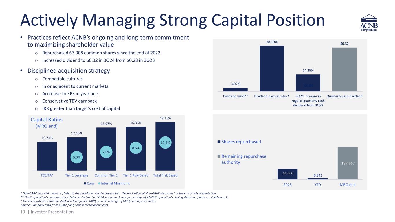 12 | Investor Presentation Strong Profitability in Tough Operating Environment • 3Q24 impacted by approximately $1.1 million in merger-related expense due to the pending acquisition of Traditions Bancorp, Inc. • 2Q24 impacted by approximately $3.2 million reversal of the provision for credit losses and unfunded commitments R O A A R O A E N IM EP S Source: Company data from public filings and internal documents. 1.52% 0.68% 1.12% 1.86% 1.17% 2Q23 3Q23 4Q23 1Q24 3Q24 Return on Average Assets 13.84% 6.09% 9.76% 16.12% 9.63% 3Q23 4Q23 1Q24 2Q24 3Q24 Return on Average Equity 4.01% 3.93% 3.77% 3.82% 3.77% 2Q23 3Q23 4Q23 1Q24 3Q24 FTE Net Interest Margin $1.06 $0.48 $0.80 $1.32 $0.84 3Q23 4Q23 1Q24 2Q24 3Q24 Diluted Earnings Per Share