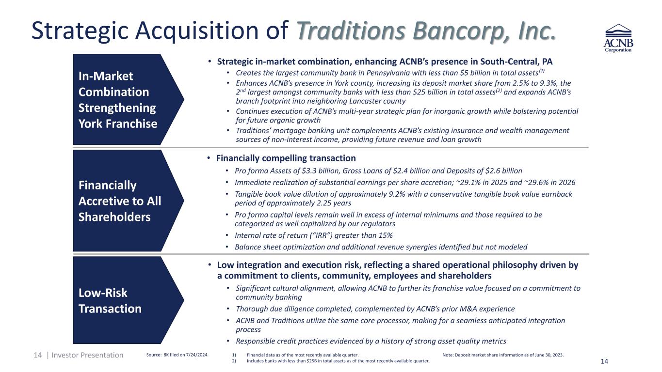 13 | Investor Presentation Actively Managing Strong Capital Position • Practices reflect ACNB’s ongoing and long-term commitment to maximizing shareholder value o Repurchased 67,908 common shares since the end of 2022 o Increased dividend to $0.32 in 3Q24 from $0.28 in 3Q23 • Disciplined acquisition strategy o Compatible cultures o In or adjacent to current markets o Accretive to EPS in year one o Conservative TBV earnback o IRR greater than target’s cost of capital * Non-GAAP financial measure ; Refer to the calculation on the pages titled “Reconciliation of Non-GAAP Measures” at the end of this presentation. ** The Corporation’s common stock dividend declared in 3Q24, annualized, as a percentage of ACNB Corporation’s closing share as of date provided on p. 2. † The Corporation’s common stock dividend paid in MRQ, as a percentage of MRQ earnings per share. Source: Company data from public filings and internal documents. 61,066 6,842 187,667 2023 YTD MRQ end Shares repurchased Remaining repurchase authority 10.74% 12.46% 16.07% 16.36% 18.15% 5.0% 7.0% 8.5% 10.5% TCE/TA* Tier 1 Leverage Common Tier 1 Tier 1 Risk-Based Total Risk Based Capital Ratios (MRQ end) Corp Internal Minimums 3.07% 38.10% 14.29% $0.04 $0.32 Dividend yield** Dividend payout ratio † 3Q24 increase in regular quarterly cash dividend from 3Q23 Quarterly cash dividend