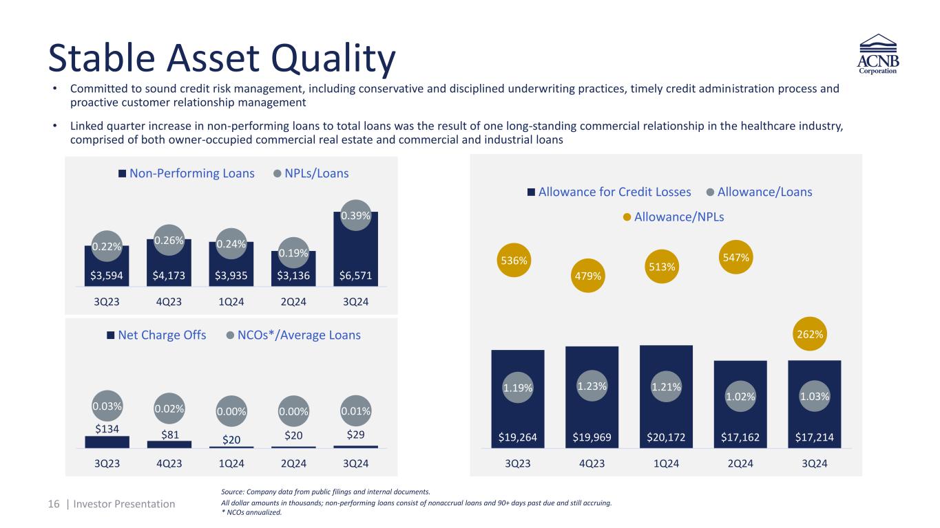 15 | Investor Presentation Ample Liquidity Position • Actively monitoring, managing and projecting our liquidity needs to minimize our liquidity risk o Liquidity monitored daily • Stable, durable and relationship-based core deposits continue to be ACNB Bank’s primary source of liquidity o 93.6% loan/deposit ratio o 13.9% unencumbered securities, cash and cash equivalents/assets ratio • ACNB’s banking subsidiary could borrow approximately $920.1 million from the FHLB of which approximately $684.0 million was available at 9/30/24 • Fed Funds line capacity at ACNB’s banking subsidiary was $192.0 million of which the full amount was available at 9/30/24 • ACNB’s banking subsidiary could borrow approximately $65.1 million from the Discount Window of which the full amount was available at 9/30/24 Source: Company data from public filings and internal documents. 75.4% 60.6% 70.0% 87.4% 93.6% 17.7% 29.1% 17.1% 14.5% 13.9% 12/31/20 12/31/21 12/31/22 12/31/23 MRQ end Loans/Deposits Unencumbered Securities, Cash & Cash Equivalents /Assets