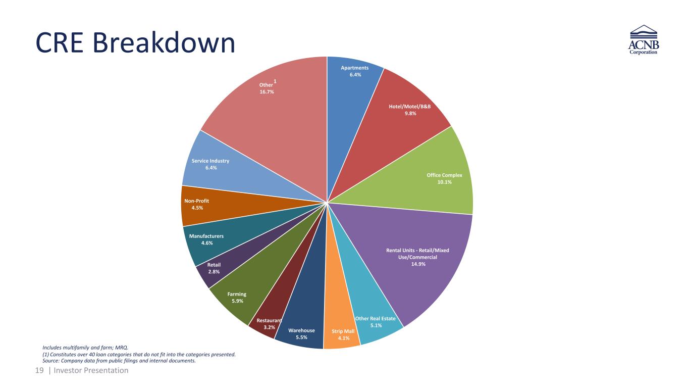 19 | Investor Presentation Apartments 6.4% Hotel/Motel/B&B 9.8% Office Complex 10.1% Rental Units - Retail/Mixed Use/Commercial 14.9% Other Real Estate 5.1% Strip Mall 4.1% Warehouse 5.5% Restaurant 3.2% Farming 5.9% Retail 2.8% Manufacturers 4.6% Non-Profit 4.5% Service Industry 6.4% Other 16.7% CRE Breakdown Includes multifamily and farm; MRQ. (1) Constitutes over 40 loan categories that do not fit into the categories presented. 1 Source: Company data from public filings and internal documents.