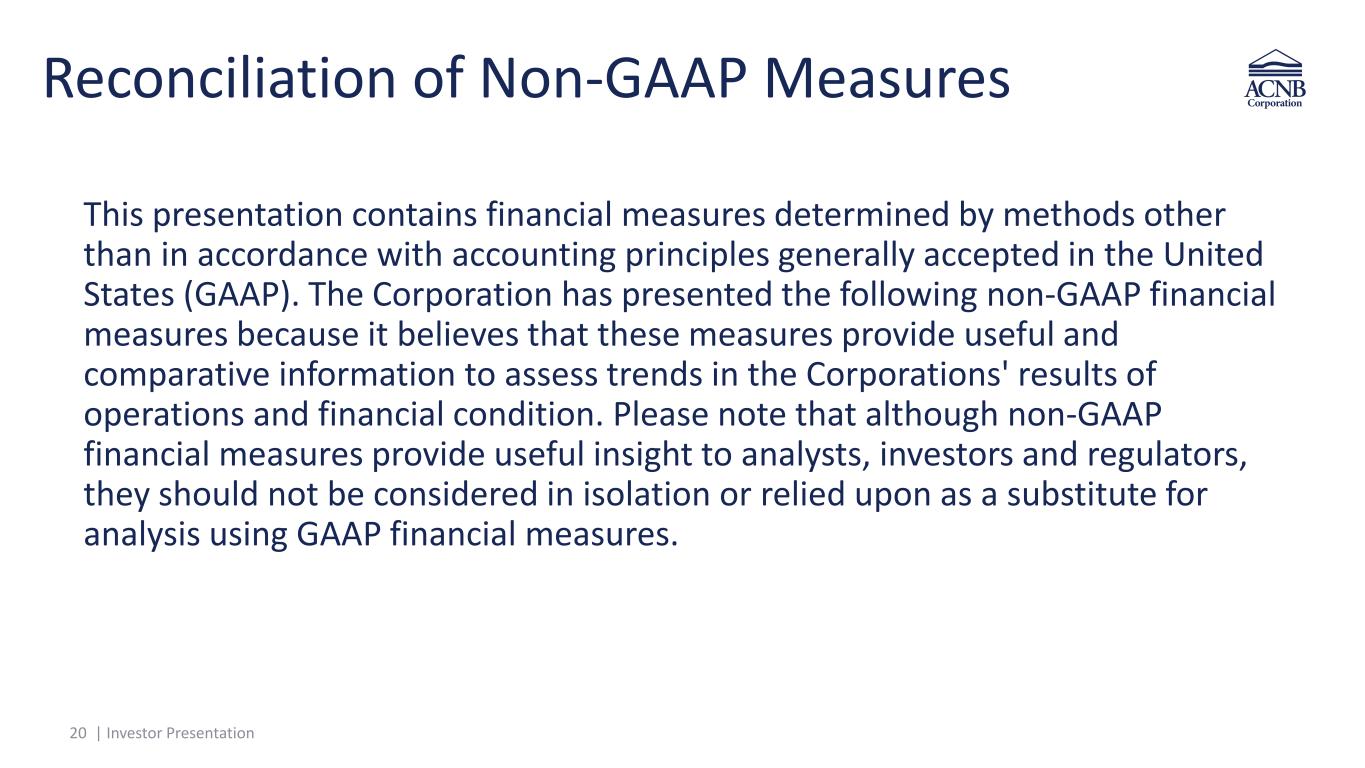 20 | Investor Presentation This presentation contains financial measures determined by methods other than in accordance with accounting principles generally accepted in the United States (GAAP). The Corporation has presented the following non-GAAP financial measures because it believes that these measures provide useful and comparative information to assess trends in the Corporations' results of operations and financial condition. Please note that although non-GAAP financial measures provide useful insight to analysts, investors and regulators, they should not be considered in isolation or relied upon as a substitute for analysis using GAAP financial measures. Reconciliation of Non-GAAP Measures 20
