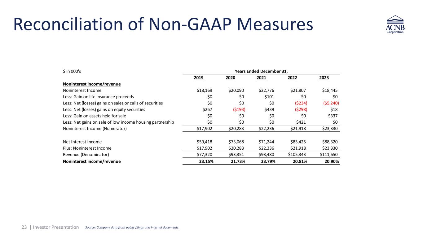 22 | Investor Presentation Reconciliation of Non-GAAP Measures 22 Source: Company data from public filings and internal documents. $ in 000's 9/30/2023 12/31/2023 3/31/2024 6/30/2024 9/30/2024 Efficiency Ratio Non-interest expense $16,336 $17,173 $17,662 $16,391 $18,244 Less: Intangible amortization $352 $352 $321 $315 $304 Less: Merger related expense $0 $0 $0 $23 $1,137 Non-interest expense (numerator) $15,984 $16,821 $17,341 $16,053 $16,803 Net interest income $21,745 $21,493 $20,593 $20,964 $20,942 Plus: Total non-interest income $6,297 $970 $5,667 $6,427 $6,833 Less: Net (losses) gains on sales or calls of securities $0 ($4,501) $69 $0 $0 Less: Net (losses) gains on equity securities ($27) $40 ($10) $1 $28 Less: Gain on assets held for sale $14 $0 $0 $0 $0 Total revenue (denominator) $28,055 $26,924 $26,201 $27,390 $27,747 Efficiency ratio 56.97% 62.48% 66.18% 58.61% 60.56% Noninterest income/revenue Noninterest Income $6,297 $970 $5,667 $6,427 $6,833 Less: Net (losses) gains on sales or calls of securities $0 ($4,501) $69 $0 $0 Less: Net (losses) gains on equity securities ($27) $40 ($10) $1 $28 Less: Gain on assets held for sale $14 $0 $0 $0 $0 Noninterest Income (Numerator) $6,310 $5,431 $5,608 $6,426 $6,805 Net Interest Income $21,745 $21,493 $20,593 $20,964 $20,942 Plus: Noninterest Income $6,310 $5,431 $5,608 $6,426 $6,805 Revenue (Denominator) $28,055 $26,924 $26,201 $27,390 $27,747 Noninterest income/revenue 22.49% 20.17% 21.40% 23.46% 24.53% Three Months Ended,