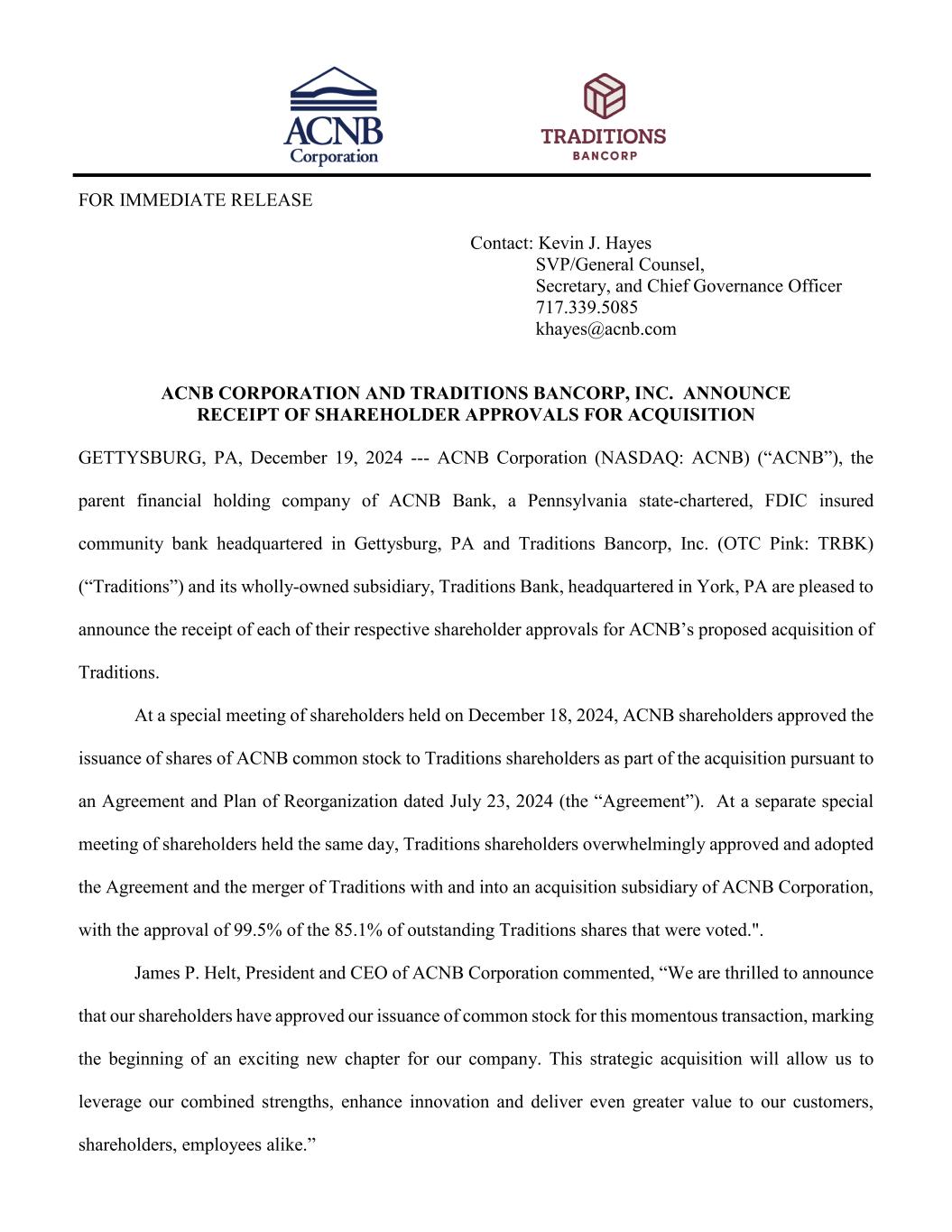 FOR IMMEDIATE RELEASE Contact: Kevin J. Hayes SVP/General Counsel, Secretary, and Chief Governance Officer 717.339.5085 khayes@acnb.com ACNB CORPORATION AND TRADITIONS BANCORP, INC. ANNOUNCE RECEIPT OF SHAREHOLDER APPROVALS FOR ACQUISITION GETTYSBURG, PA, December 19, 2024 --- ACNB Corporation (NASDAQ: ACNB) (“ACNB”), the parent financial holding company of ACNB Bank, a Pennsylvania state-chartered, FDIC insured community bank headquartered in Gettysburg, PA and Traditions Bancorp, Inc. (OTC Pink: TRBK) (“Traditions”) and its wholly-owned subsidiary, Traditions Bank, headquartered in York, PA are pleased to announce the receipt of each of their respective shareholder approvals for ACNB’s proposed acquisition of Traditions. At a special meeting of shareholders held on December 18, 2024, ACNB shareholders approved the issuance of shares of ACNB common stock to Traditions shareholders as part of the acquisition pursuant to an Agreement and Plan of Reorganization dated July 23, 2024 (the “Agreement”). At a separate special meeting of shareholders held the same day, Traditions shareholders overwhelmingly approved and adopted the Agreement and the merger of Traditions with and into an acquisition subsidiary of ACNB Corporation, with the approval of 99.5% of the 85.1% of outstanding Traditions shares that were voted.". James P. Helt, President and CEO of ACNB Corporation commented, “We are thrilled to announce that our shareholders have approved our issuance of common stock for this momentous transaction, marking the beginning of an exciting new chapter for our company. This strategic acquisition will allow us to leverage our combined strengths, enhance innovation and deliver even greater value to our customers, shareholders, employees alike.”