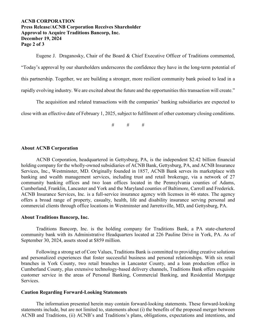 ACNB CORPORATION Press Release/ACNB Corporation Receives Shareholder Approval to Acquire Traditions Bancorp, Inc. December 19, 2024 Page 2 of 3 Eugene J. Draganosky, Chair of the Board & Chief Executive Officer of Traditions commented, “Today’s approval by our shareholders underscores the confidence they have in the long-term potential of this partnership. Together, we are building a stronger, more resilient community bank poised to lead in a rapidly evolving industry. We are excited about the future and the opportunities this transaction will create.” The acquisition and related transactions with the companies’ banking subsidiaries are expected to close with an effective date of February 1, 2025, subject to fulfilment of other customary closing conditions. # # # About ACNB Corporation ACNB Corporation, headquartered in Gettysburg, PA, is the independent $2.42 billion financial holding company for the wholly-owned subsidiaries of ACNB Bank, Gettysburg, PA, and ACNB Insurance Services, Inc., Westminster, MD. Originally founded in 1857, ACNB Bank serves its marketplace with banking and wealth management services, including trust and retail brokerage, via a network of 27 community banking offices and two loan offices located in the Pennsylvania counties of Adams, Cumberland, Franklin, Lancaster and York and the Maryland counties of Baltimore, Carroll and Frederick. ACNB Insurance Services, Inc. is a full-service insurance agency with licenses in 46 states. The agency offers a broad range of property, casualty, health, life and disability insurance serving personal and commercial clients through office locations in Westminster and Jarrettsville, MD, and Gettysburg, PA. About Traditions Bancorp, Inc. Traditions Bancorp, Inc. is the holding company for Traditions Bank, a PA state-chartered community bank with its Administrative Headquarters located at 226 Pauline Drive in York, PA. As of September 30, 2024, assets stood at $859 million. Following a strong set of Core Values, Traditions Bank is committed to providing creative solutions and personalized experiences that foster successful business and personal relationships. With six retail branches in York County, two retail branches in Lancaster County, and a loan production office in Cumberland County, plus extensive technology-based delivery channels, Traditions Bank offers exquisite customer service in the areas of Personal Banking, Commercial Banking, and Residential Mortgage Services. Caution Regarding Forward-Looking Statements The information presented herein may contain forward-looking statements. These forward-looking statements include, but are not limited to, statements about (i) the benefits of the proposed merger between ACNB and Traditions, (ii) ACNB’s and Traditions’s plans, obligations, expectations and intentions, and