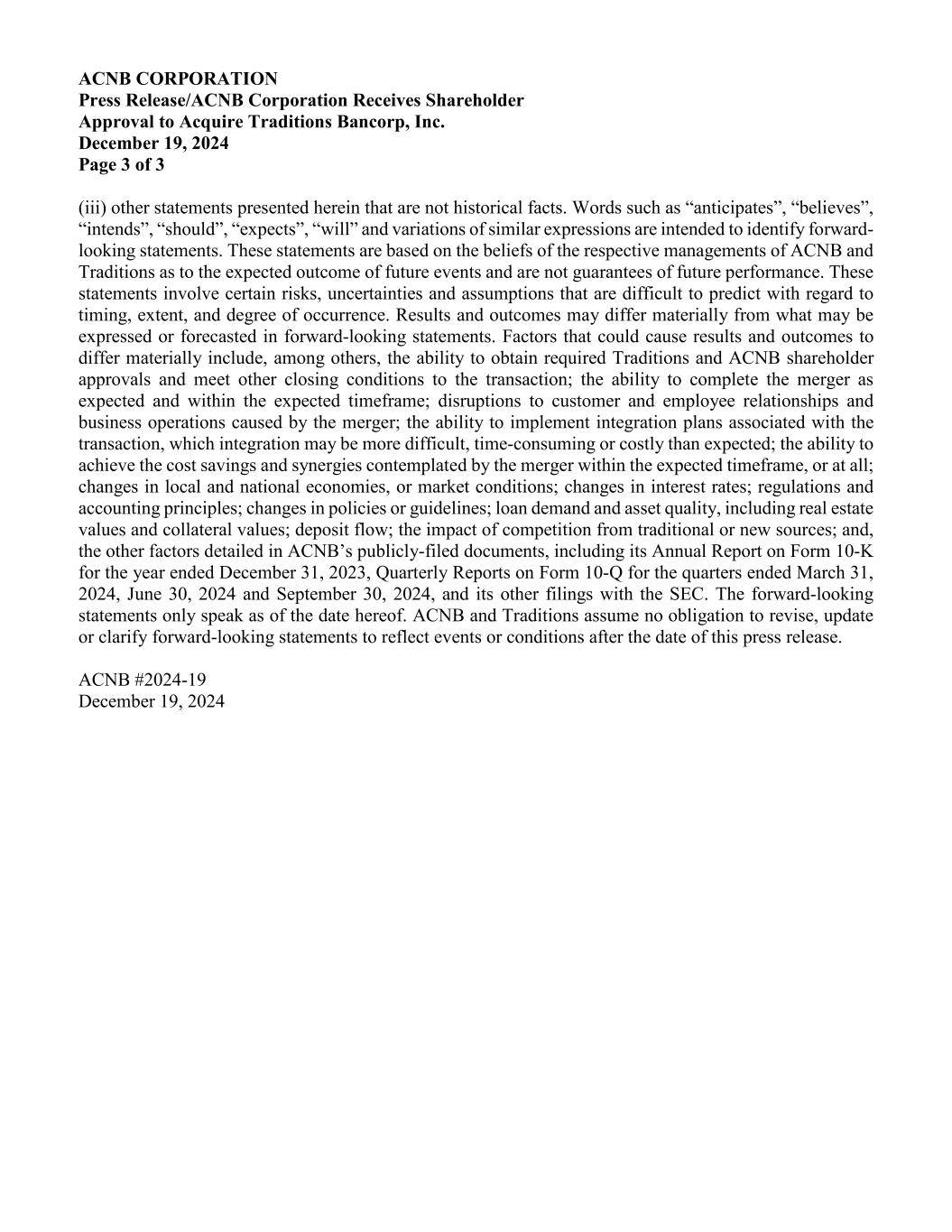 ACNB CORPORATION Press Release/ACNB Corporation Receives Shareholder Approval to Acquire Traditions Bancorp, Inc. December 19, 2024 Page 3 of 3 (iii) other statements presented herein that are not historical facts. Words such as “anticipates”, “believes”, “intends”, “should”, “expects”, “will” and variations of similar expressions are intended to identify forward- looking statements. These statements are based on the beliefs of the respective managements of ACNB and Traditions as to the expected outcome of future events and are not guarantees of future performance. These statements involve certain risks, uncertainties and assumptions that are difficult to predict with regard to timing, extent, and degree of occurrence. Results and outcomes may differ materially from what may be expressed or forecasted in forward-looking statements. Factors that could cause results and outcomes to differ materially include, among others, the ability to obtain required Traditions and ACNB shareholder approvals and meet other closing conditions to the transaction; the ability to complete the merger as expected and within the expected timeframe; disruptions to customer and employee relationships and business operations caused by the merger; the ability to implement integration plans associated with the transaction, which integration may be more difficult, time-consuming or costly than expected; the ability to achieve the cost savings and synergies contemplated by the merger within the expected timeframe, or at all; changes in local and national economies, or market conditions; changes in interest rates; regulations and accounting principles; changes in policies or guidelines; loan demand and asset quality, including real estate values and collateral values; deposit flow; the impact of competition from traditional or new sources; and, the other factors detailed in ACNB’s publicly-filed documents, including its Annual Report on Form 10-K for the year ended December 31, 2023, Quarterly Reports on Form 10-Q for the quarters ended March 31, 2024, June 30, 2024 and September 30, 2024, and its other filings with the SEC. The forward-looking statements only speak as of the date hereof. ACNB and Traditions assume no obligation to revise, update or clarify forward-looking statements to reflect events or conditions after the date of this press release. ACNB #2024-19 December 19, 2024