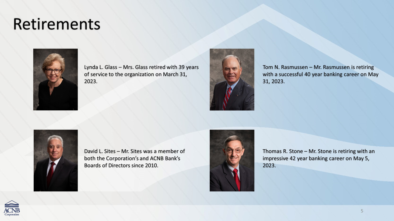 Retirements Lynda L. Glass – Mrs. Glass retired with 39 years of service to the organization on March 31, 2023. Tom N. Rasmussen – Mr. Rasmussen is retiring with a successful 40 year banking career on May 31, 2023. David L. Sites – Mr. Sites was a member of both the Corporation’s and ACNB Bank’s Boards of Directors since 2010. Thomas R. Stone – Mr. Stone is retiring with an impressive 42 year banking career on May 5, 2023. 5