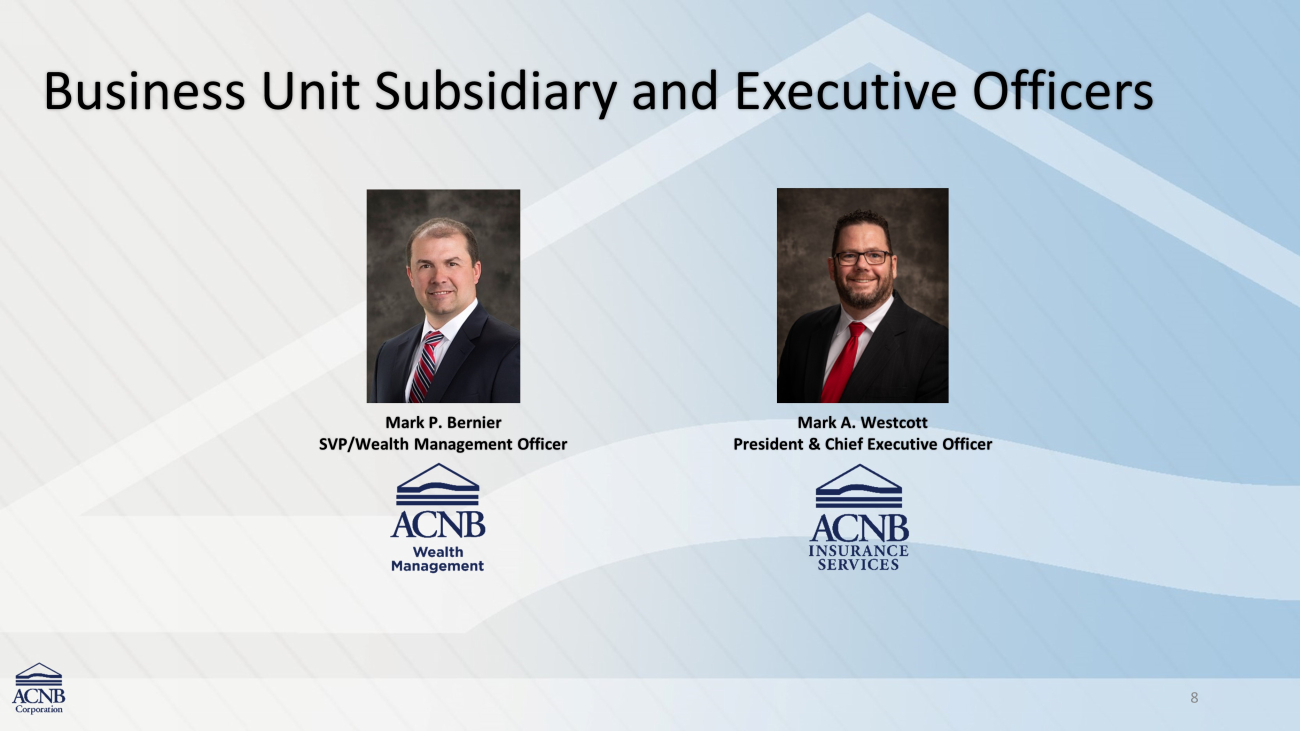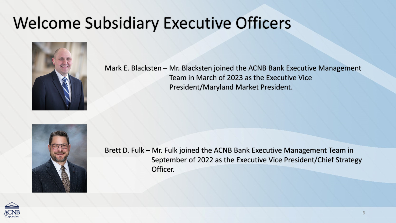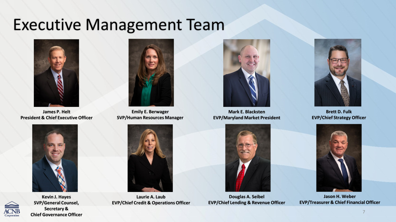 Welcome Subsidiary Executive Officers Mark E. Blacksten – Mr. Blacksten joined the ACNB Bank Executive Management Team in March of 2023 as the Executive Vice President/Maryland Market President. Brett D. Fulk – Mr. Fulk joined the ACNB Bank Executive Management Team in September of 2022 as the Executive Vice President/Chief Strategy Officer. 6
