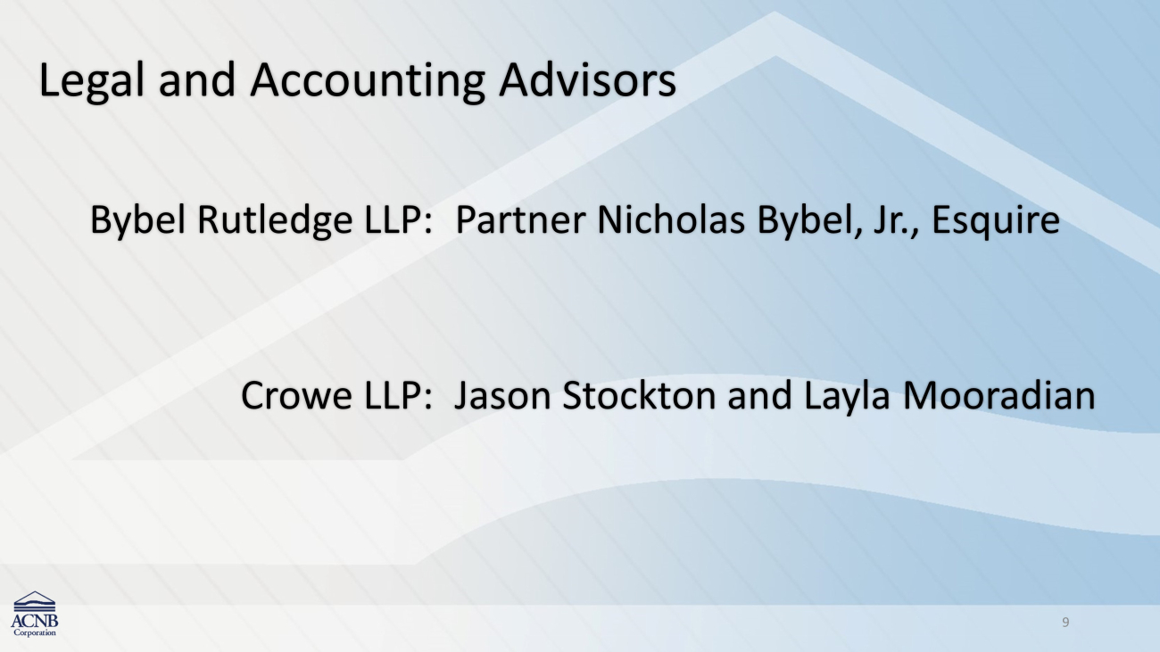 Legal and Accounting Advisors Partner Nicholas Bybel, Jr., Esquire Jason Stockton and Layla Mooradian 9 Bybel Rutledge LLP: Crowe LLP: