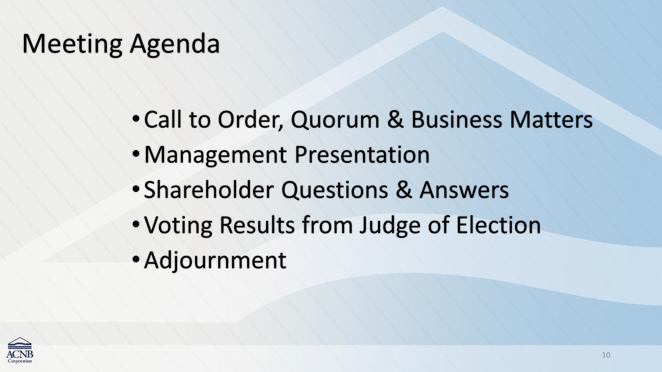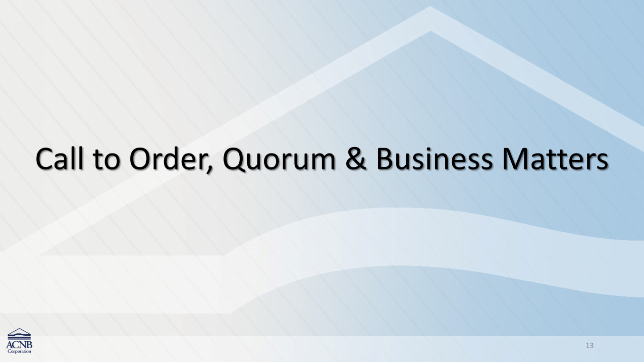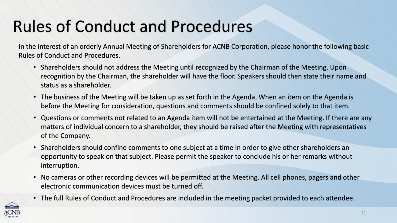 In the interest of an orderly Annual Meeting of Shareholders for ACNB Corporation, please honor the following basic Rules of Conduct and Procedures. • Shareholders should not address the Meeting until recognized by the Chairman of the Meeting. Upon recognition by the Chairman, the shareholder will have the floor. Speakers should then state their name and status as a shareholder. • The business of the Meeting will be taken up as set forth in the Agenda. When an item on the Agenda is before the Meeting for consideration, questions and comments should be confined solely to that item. • Questions or comments not related to an Agenda item will not be entertained at the Meeting. If there are any matters of individual concern to a shareholder, they should be raised after the Meeting with representatives of the Company. • Shareholders should confine comments to one subject at a time in order to give other shareholders an opportunity to speak on that subject. Please permit the speaker to conclude his or her remarks without interruption. • No cameras or other recording devices will be permitted at the Meeting. All cell phones, pagers and other electronic communication devices must be turned off. • The full Rules of Conduct and Procedures are included in the meeting packet provided to each attendee. Rules of Conduct and Procedures 11