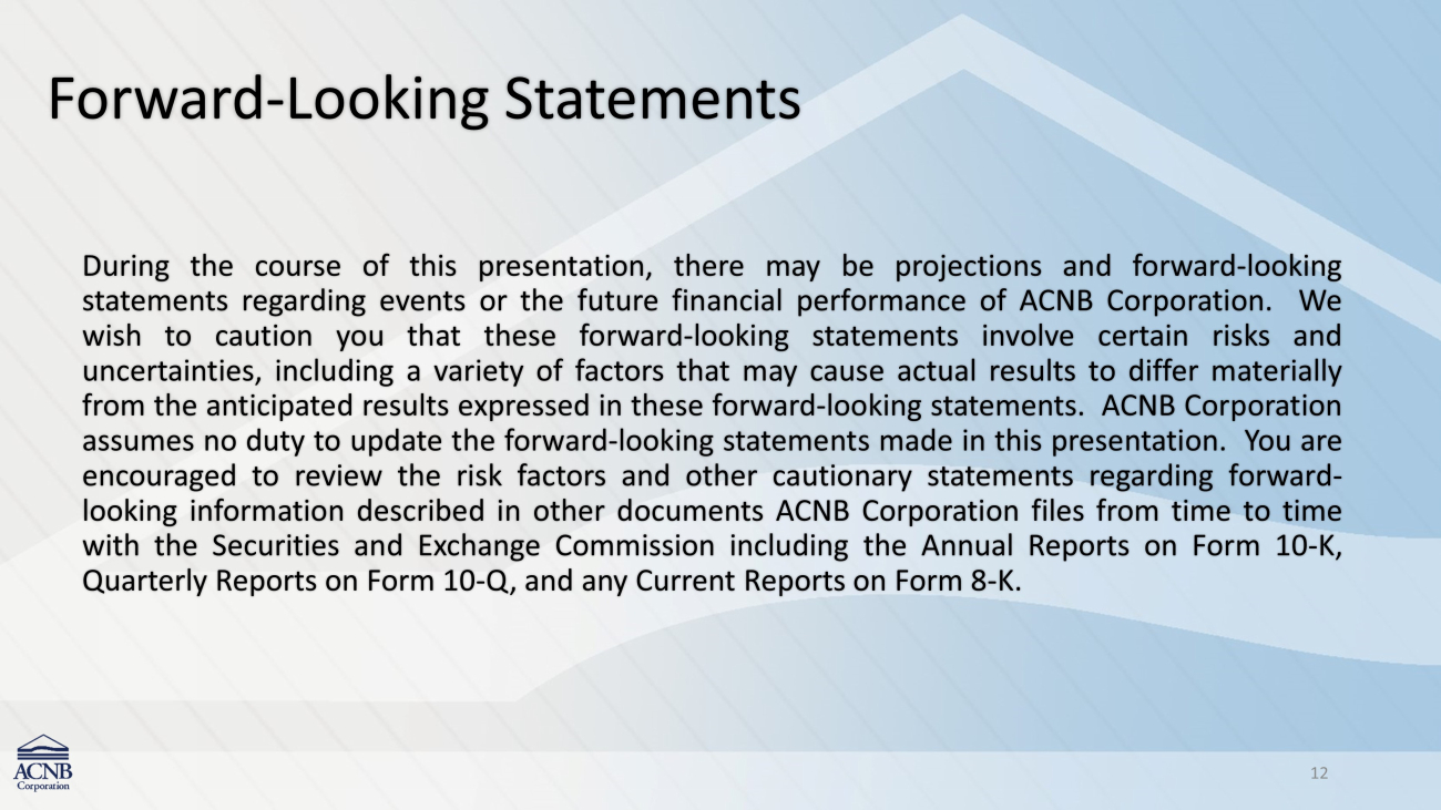 During the course of this presentation, there may be projections and forward - looking statements regarding events or the future financial performance of ACNB Corporation . We wish to caution you that these forward - looking statements involve certain risks and uncertainties, including a variety of factors that may cause actual results to differ materially from the anticipated results expressed in these forward - looking statements . ACNB Corporation assumes no duty to update the forward - looking statements made in this presentation . You are encouraged to review the risk factors and other cautionary statements regarding forward - looking information described in other documents ACNB Corporation files from time to time with the Securities and Exchange Commission including the Annual Reports on Form 10 - K, Quarterly Reports on Form 10 - Q, and any Current Reports on Form 8 - K . Forward - Looking Statements 12