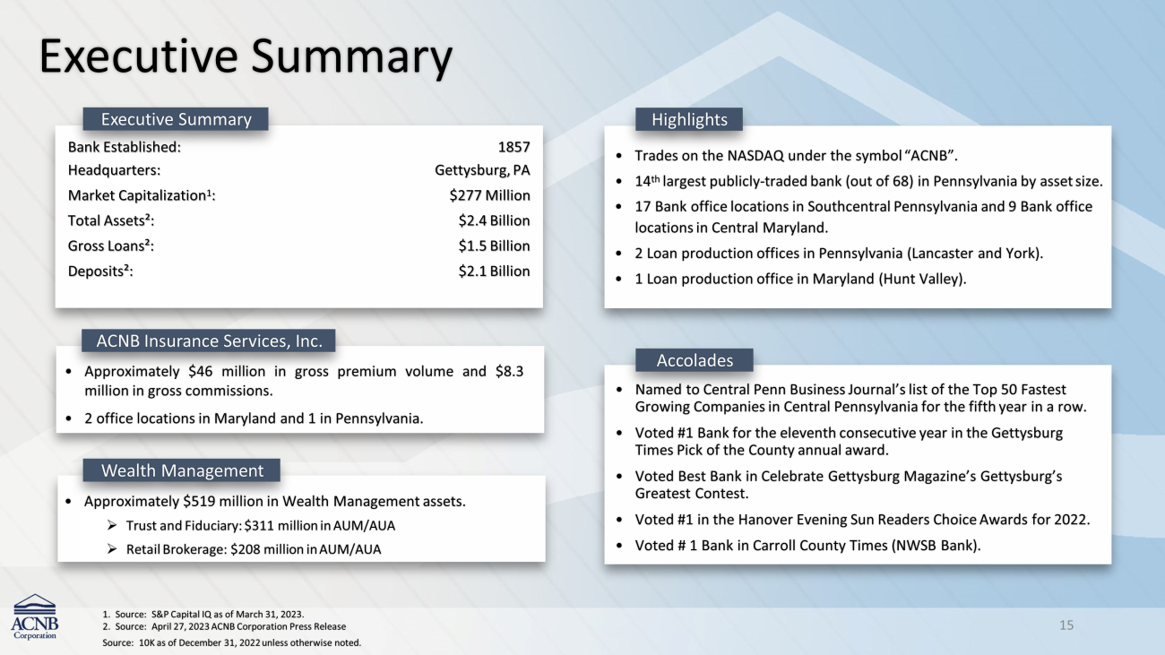 1. Source: S&P Capital IQ as of March 31, 2023. 2. Source: April 27, 2023 ACNB Corporation Press Release Executive Summary Source: 10K as of December 31, 2022 unless otherwise noted. 15 • Approximately $ 46 million in gross premium volume and $ 8 . 3 million in gross commissions . • 2 office locations in Maryland and 1 in Pennsylvania . ACNB Insurance Services, Inc. • Approximately $519 million in Wealth Management assets. » Trust and Fiduciary: $311 million in AUM/AUA » Retail Brokerage: $208 million in AUM/AUA Wealth Management • Trades on the NASDAQ under the symbol “ACNB” . • 1 4 th largest publicly - traded bank (out of 68 ) in Pennsylvania by asset size . • 17 Bank office locations in Southcentral Pennsylvania and 9 Bank office location s in Central Maryland . • 2 Loan production offices in Pennsylvania (Lancaster and York). • 1 Loan production office in Maryland (Hunt Valley). Highlights • Named to Central Penn Business Journal’s list of the Top 50 Fastest Growing Companies in Central Pennsylvania for the fifth year in a row. • Voted #1 Bank for the eleventh consecutive year in the Gettysburg Times Pick of the County annual award. • Voted Best Bank in Celebrate Gettysburg Magazine’s Gettysburg’s Greatest Contest. • Voted #1 in the Hanover Evening Sun Readers Choice Awards for 202 2 . • Voted # 1 Bank in Carroll County Times (NWSB Bank). Accolades Bank Established: 1857 Headquarters: Gettysburg, PA Market Capitalization 1 : $ 277 Million Total Assets ² : $ 2.4 Billion Gross Loans ² : $1. 5 Billion Deposits ² : $2. 1 Billion Executive Summary