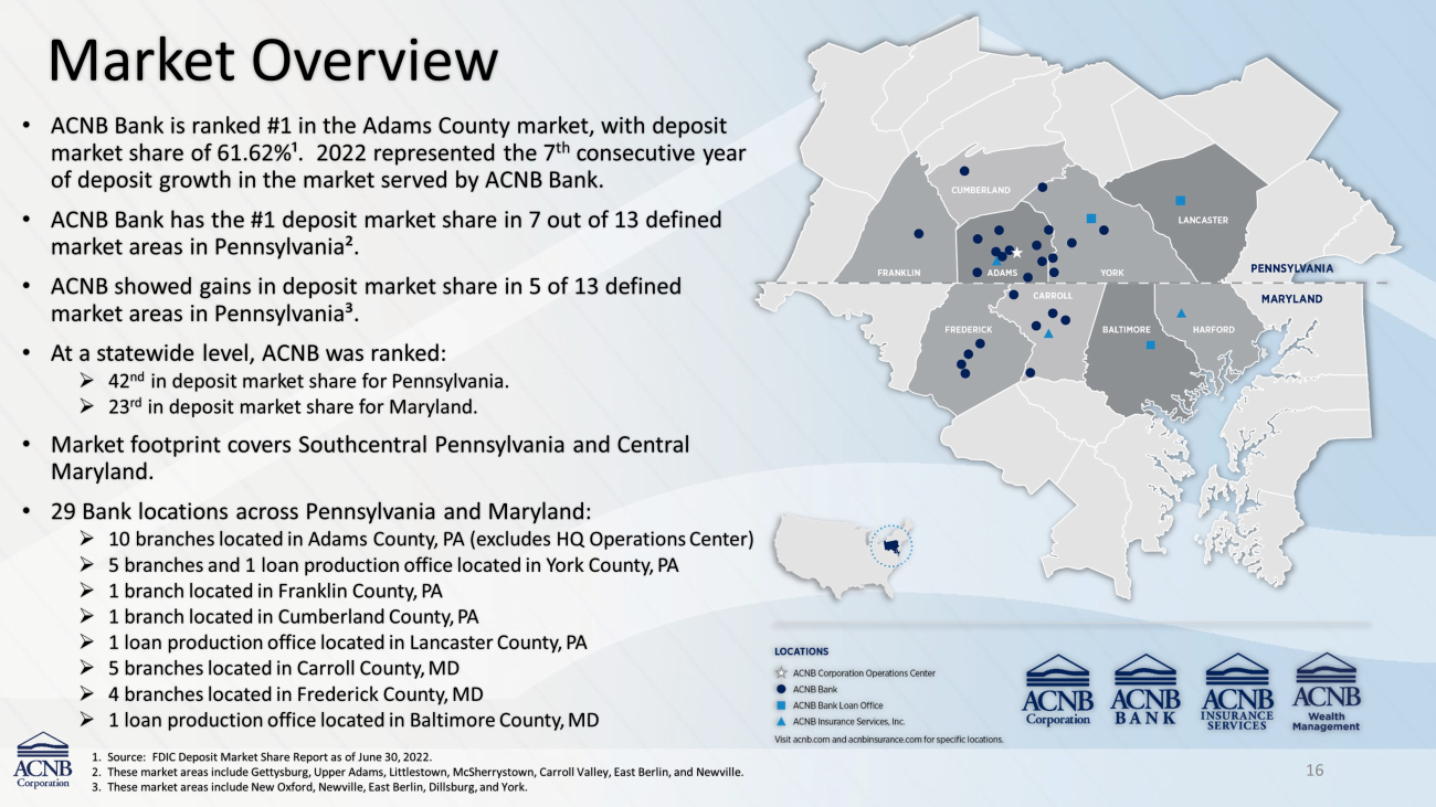 Market Overview 1. Source: FDIC Deposit Market Share Report as of June 30, 2022. 2. These market areas include Gettysburg, Upper Adams, Littlestown, McSherrystown, Carroll Valley, East Berlin, and Newville. 3. These market areas include New Oxford, Newville, East Berlin, Dillsburg, and York. • ACNB Bank is ranked #1 in the Adams County market, with deposit market share of 61.62%¹. 2022 represented the 7 th consecutive year of deposit growth in the market served by ACNB Bank. • ACNB Bank has the #1 deposit market share in 7 out of 13 defined market areas in Pennsylvania ². • ACNB showed gains in deposit market share in 5 of 13 defined market areas in Pennsylvania³. • At a statewide level, ACNB was ranked: » 42 nd in deposit market share for Pennsylvania. » 23 rd in deposit market share for Maryland. • Market footprint covers Southcentral Pennsylvania and Central Maryland. • 29 Bank locations across Pennsylvania and Maryland: » 10 branches located in Adams County, PA (excludes HQ Operations Center) » 5 branches and 1 loan production office located in York County, PA » 1 branch located in Franklin County, PA » 1 branch located in Cumberland County, PA » 1 loan production office located in Lancaster County, PA » 5 branches located in Carroll County, MD » 4 branches located in Frederick County, MD » 1 loan production office located in Baltimore County, MD 16