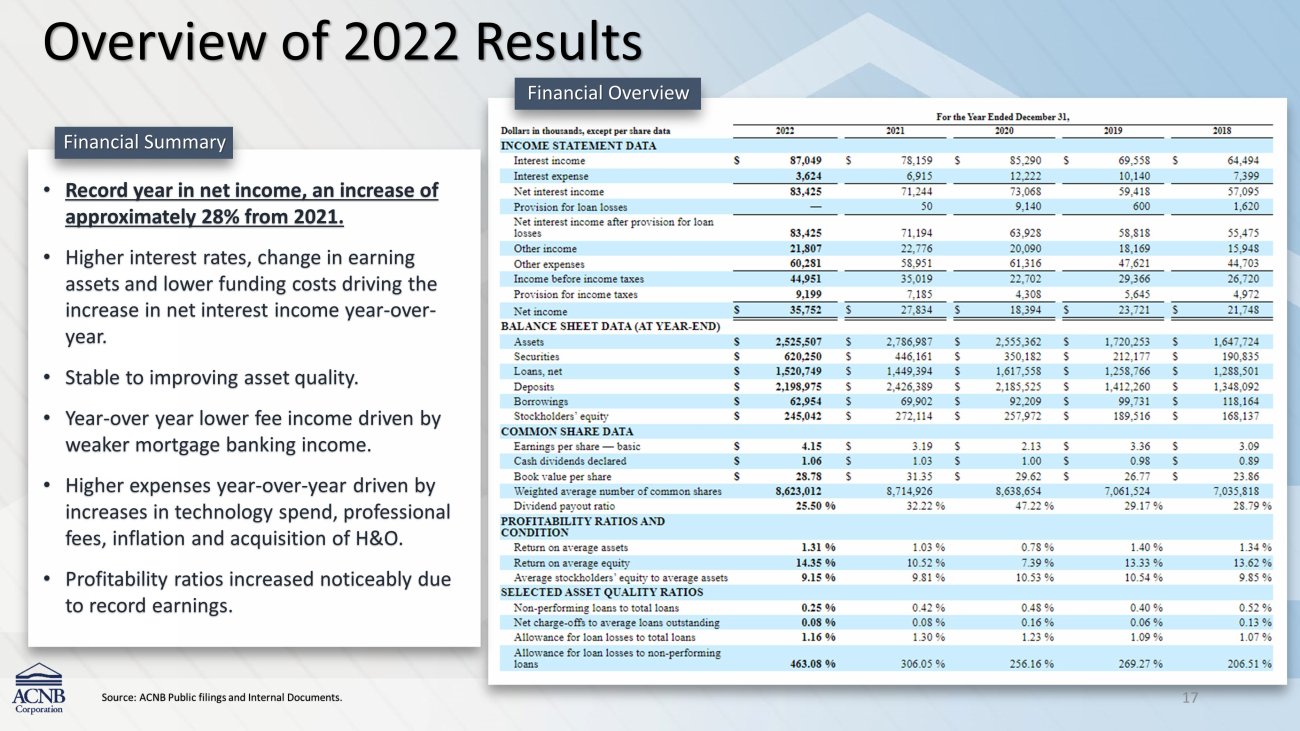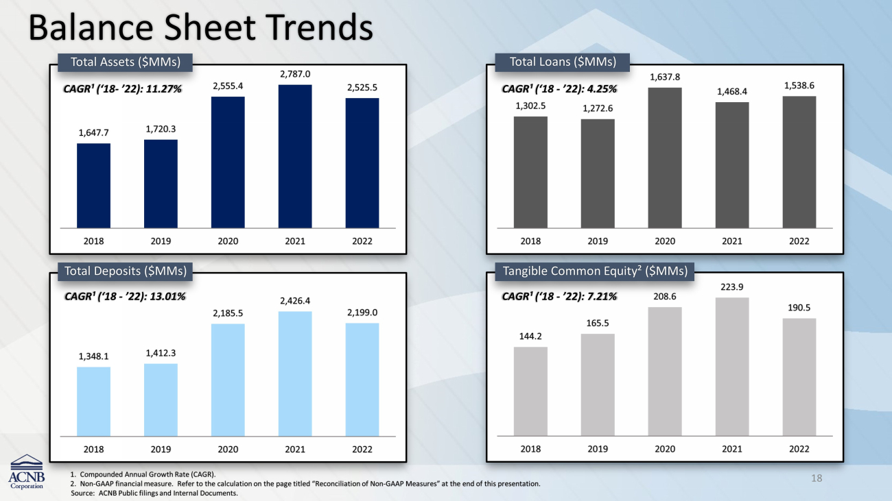Overview of 2022 Results • Record year in net income, an increase of approximately 28% from 2021. • Higher interest rates, change in earning assets and lower funding costs driving the increase in net interest income year - over - year. • Stable to improving asset quality. • Year - over year lower fee income driven by weaker mortgage banking income. • Higher expenses year - over - year driven by increases in technology spend, professional fees, inflation and acquisition of H&O. • Profitability ratios increased noticeably due to record earnings. Financial Summary 17 Source: ACNB Public filings and Internal Documents. Financial Overview