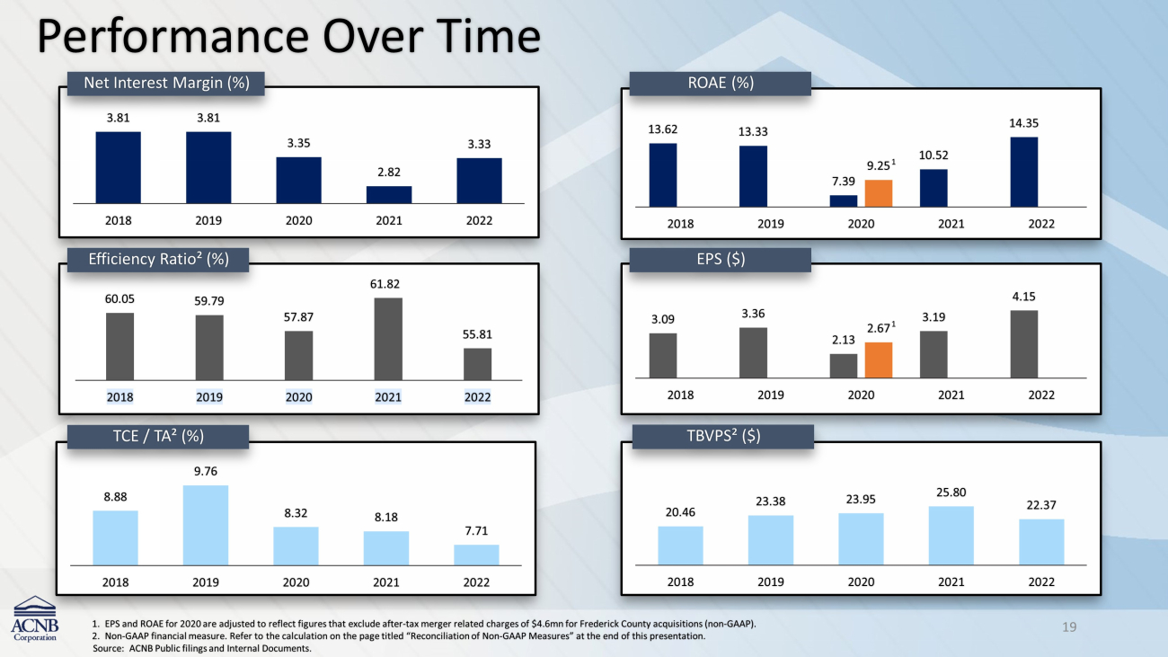 1. Compounded Annual Growth Rate (CAGR). 2. Non - GAAP financial measure. Refer to the calculation on the page titled “Reconciliation of Non - GAAP Measures” at the end of thi s presentation. Balance Sheet Trends Source: ACNB Public filings and Internal Documents. 18 1,647.7 1,720.3 2,555.4 2,787.0 2,525.5 2018 2019 2020 2021 2022 Total Assets ($MMs) CAGR¹ (‘18 - ’22): 11.27% 1,302.5 1,272.6 1,637.8 1,468.4 1,538.6 2018 2019 2020 2021 2022 CAGR¹ (‘18 - ’22): 4.25% Total Loans ($MMs) 1,348.1 1,412.3 2,185.5 2,426.4 2,199.0 2018 2019 2020 2021 2022 CAGR¹ (‘18 - ’22): 13.01% Total Deposits ($MMs) 144.2 165.5 208.6 223.9 190.5 2018 2019 2020 2021 2022 CAGR¹ (‘18 - ’22): 7.21% Tangible Common Equity ² ($MMs)