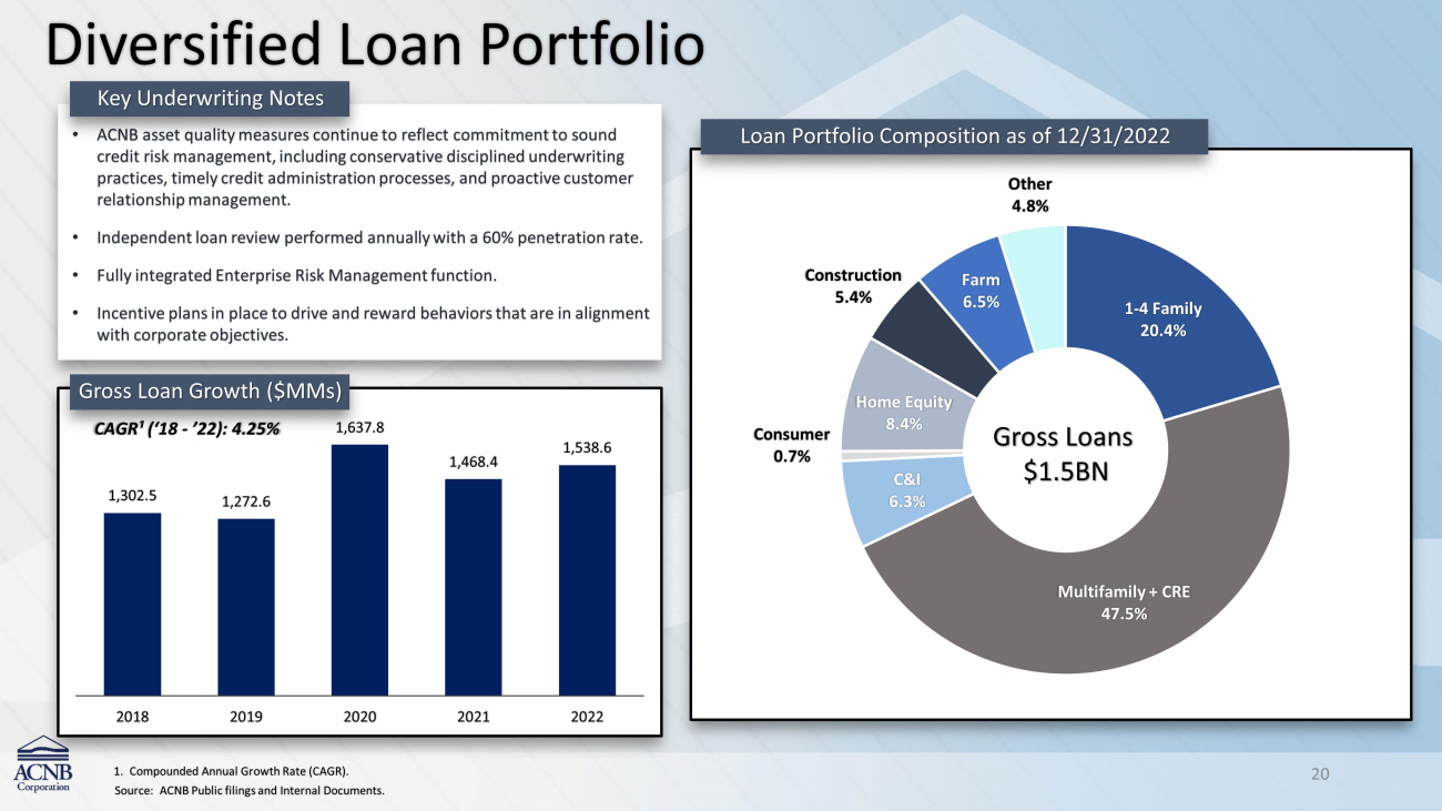 60.05 59.79 57.87 61.82 55.81 2018 2019 2020 2021 2022 1. EPS and ROAE for 2020 are adjusted to reflect figures that exclude after - tax merger related charges of $4.6mn for Frederick Coun ty acquisitions (non - GAAP). 2. Non - GAAP financial measure. Refer to the calculation on the page titled “Reconciliation of Non - GAAP Measures” at the end of this presentation. Performance Over Time Source: ACNB Public filings and Internal Documents. 19 3.81 3.81 3.35 2.82 3.33 2018 2019 2020 2021 2022 Net Interest Margin (%) Efficiency Ratio ² (%) 8.88 9.76 8.32 8.18 7.71 2018 2019 2020 2021 2022 TCE / TA ² (%) 13.62 13.33 7.39 10.52 14.35 9.25 2018 2019 2020 2021 2022 ROAE (%) 3.09 3.36 2.13 3.19 4.15 2.67 2018 2019 2020 2021 2022 EPS ($) 20.46 23.38 23.95 25.80 22.37 2018 2019 2020 2021 2022 TBVPS ² ($) 1 1