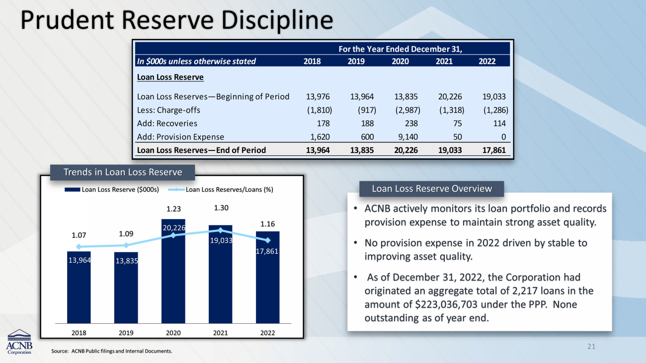 Diversified Loan Portfolio 20 1. Compounded Annual Growth Rate (CAGR). Source: ACNB Public filings and Internal Documents. • ACNB asset quality measures continue to reflect commitment to sound credit risk management, including conservative disciplined underwriting practices, timely credit administration processes, and proactive customer relationship management. • Independent loan review performed annually with a 60% penetration rate. • Fully integrated Enterprise Risk Management function. • Incentive plans in place to drive and reward behaviors that are in alignment with corporate objectives. Key Underwriting Notes 1 - 4 Family 20.4% Multifamily + CRE 47.5% C&I 6.3% Consumer 0.7% Home Equity 8.4% Construction 5.4% Farm 6.5% Other 4.8% 1,302.5 1,272.6 1,637.8 1,468.4 1,538.6 2018 2019 2020 2021 2022 Gross Loan Growth ($MMs) CAGR¹ (‘18 - ’22): 4.25% Loan Portfolio Composition as of 12/31/2022 Gross Loans $1.5BN