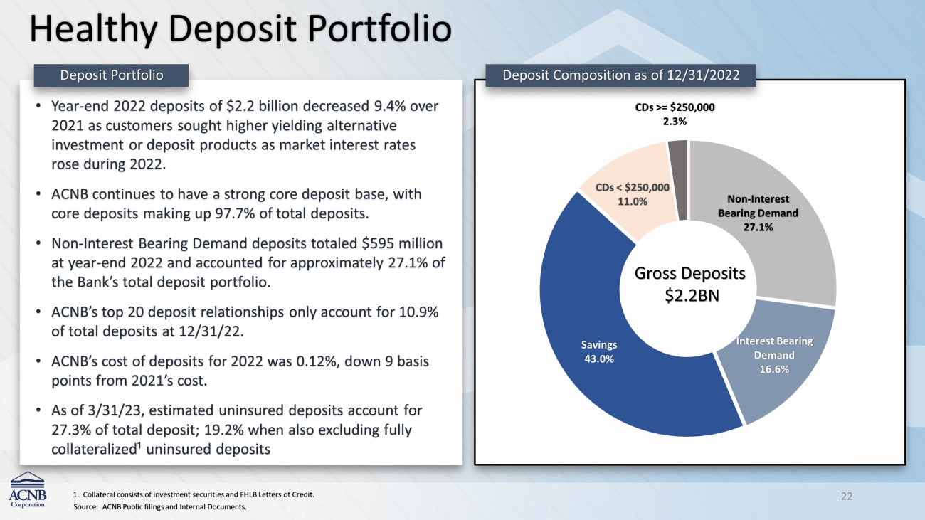 For the Year Ended December 31, In $000s unless otherwise stated 2018 2019 2020 2021 2022 Loan Loss Reserve Loan Loss Reserves—Beginning of Period 13,976 13,964 13,835 20,226 19,033 Less: Charge-offs (1,810) (917) (2,987) (1,318) (1,286) Add: Recoveries 178 188 238 75 114 Add: Provision Expense 1,620 600 9,140 50 0 Loan Loss Reserves—End of Period 13,964 13,835 20,226 19,033 17,861 13,964 13,835 20,226 19,033 17,861 1.07 1.09 1.23 1.30 1.16 0.00 0.20 0.40 0.60 0.80 1.00 1.20 1.40 1.60 1.80 - 5,000 10,000 15,000 20,000 25,000 2018 2019 2020 2021 2022 Loan Loss Reserve ($000s) Loan Loss Reserves/Loans (%) Prudent Reserve Discipline 21 Source: ACNB Public filings and Internal Documents. • ACNB actively monitors its loan portfolio and records provision expense to maintain strong asset quality. • No provision expense in 2022 driven by stable to improving asset quality. • As of December 31, 2022, the Corporation had originated an aggregate total of 2,217 loans in the amount of $223,036,703 under the PPP. None outstanding as of year end. Loan Loss Reserve Overview Trends in Loan Loss Reserve