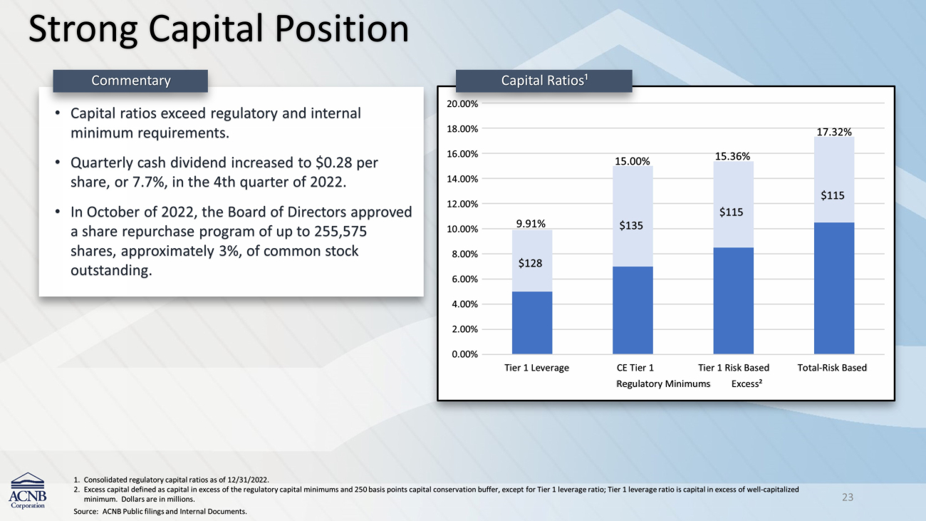 Healthy Deposit Portfolio 22 • Year - end 2022 deposits of $2.2 billion decreased 9.4% over 2021 as customers sought higher yielding alternative investment or deposit products as market interest rates rose during 2022. • ACNB continues to have a strong core deposit base, with core deposits making up 97.7% of total deposits. • Non - Interest Bearing Demand deposits totaled $595 million at year - end 2022 and accounted for approximately 27.1% of the Bank’s total deposit portfolio. • ACNB’s top 20 deposit relationships only account for 10.9% of total deposits at 12/31/22. • ACNB’s cost of deposits for 2022 was 0.12%, down 9 basis points from 2021’s cost. • As of 3/31/23, estimated uninsured deposits account for 27.3% of total deposit; 19.2% when also excluding fully collateralized¹ uninsured deposits Deposit Portfolio 1. Collateral consists of investment securities and FHLB Letters of Credit. Source: ACNB Public filings and Internal Documents. Non - Interest Bearing Demand 27.1% Interest Bearing Demand 16.6% Savings 43.0% CDs < $250,000 11.0% CDs >= $250,000 2.3% Gross Deposits $2.2BN Deposit Composition as of 12/31/2022