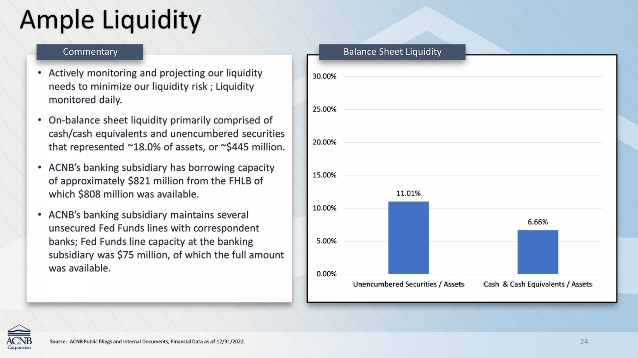 0.00% 2.00% 4.00% 6.00% 8.00% 10.00% 12.00% 14.00% 16.00% 18.00% 20.00% Tier 1 Leverage CE Tier 1 Tier 1 Risk Based Total-Risk Based Regulatory Minimums Excess² 0.00% 2.00% 4.00% 6.00% 8.00% 10.00% 12.00% 14.00% 16.00% 18.00% 20.00% Tier 1 Leverage CE Tier 1 Tier 1 Risk Based Total-Risk Based Regulatory Minimums Excess (2) Strong Capital Position 23 • Capital ratios exceed regulatory and internal minimum requirements. • Quarterly cash dividend increased to $0.28 per share, or 7.7%, in the 4th quarter of 2022. • In October of 2022, the Board of Directors approved a share repurchase program of up to 255,575 shares, approximately 3%, of common stock outstanding. Commentary 1. Consolidated regulatory capital ratios as of 12/31/2022. 2. Excess capital defined as capital in excess of the regulatory capital minimums and 250 basis points capital conservation buff er, except for Tier 1 leverage ratio; Tier 1 leverage ratio is capital in excess of well - capitalized minimum. Dollars are in millions. Source: ACNB Public filings and Internal Documents. Capital Ratios¹ 9.91% 15.00% $128 $135 15.36% 17.32% $115 $115