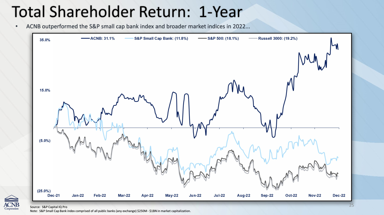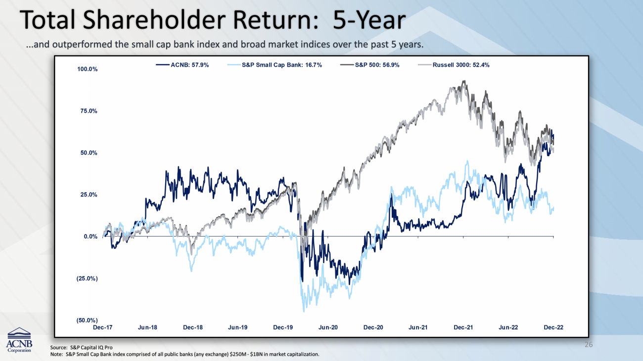 Total Shareholder Return: 1 - Year 25 Source: S&P Capital IQ Pro Note: S&P Small Cap Bank index comprised of all public banks (any exchange) $250M - $1BN in market capitalization. (25.0%) (5.0%) 15.0% 35.0% Dec-21 Jan-22 Feb-22 Mar-22 Apr-22 May-22 Jun-22 Jul-22 Aug-22 Sep-22 Oct-22 Nov-22 Dec-22 ACNB: 31.1% S&P Small Cap Bank: (11.8%) S&P 500: (18.1%) Russell 3000: (19.2%) (25.0%) (5.0%) 15.0% 35.0% Dec-21 Jan-22 Feb-22 Mar-22 Apr-22 May-22 Jun-22 Jul-22 Aug-22 Sep-22 Oct-22 Nov-22 Dec-22 ACNB: 31.1% S&P Small Cap Bank: (11.8%) S&P 500: (18.1%) Russell 3000: (19.2%) • ACNB outperformed the S&P small cap bank index and broader market indices in 2022...
