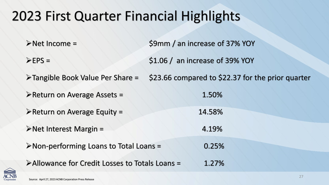 Total Shareholder Return: 5 - Year 26 Source: S&P Capital IQ Pro Note: S&P Small Cap Bank index comprised of all public banks (any exchange) $250M - $1BN in market capitalization. ...and outperformed the small cap bank index and broad market indices over the past 5 years. (50.0%) (25.0%) 0.0% 25.0% 50.0% 75.0% 100.0% Dec-17 Jun-18 Dec-18 Jun-19 Dec-19 Jun-20 Dec-20 Jun-21 Dec-21 Jun-22 Dec-22 ACNB: 57.9% S&P Small Cap Bank: 16.7% S&P 500: 56.9% Russell 3000: 52.4%