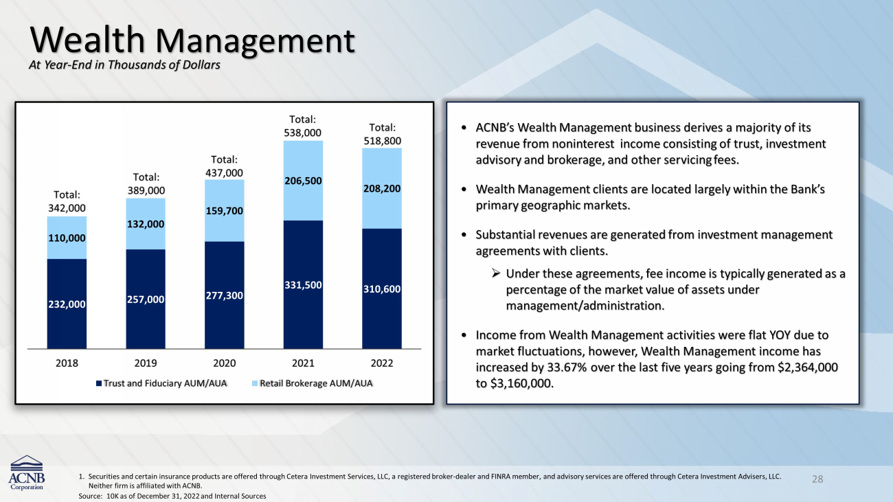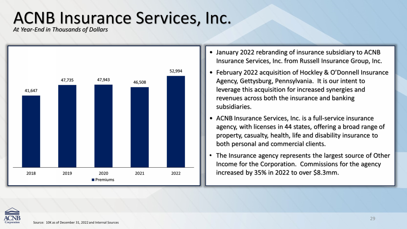 Wealth Management At Year - End in Thousands of Dollars • ACNB’s W ealth M anagement business derives a majority of its revenue from noninterest income consisting of trust, investment advisory and brokerage, and other servicing fees. • Wealth Management clients are located largely within the Bank’s primary geographic markets. • Substantial revenues are generated from investment management agreements with clients. » Under these agreements, fee income is typically generated as a percentage of the market value of assets under management/administration. • Income from Wealth Management activities were flat YOY due to market fluctuations, however, Wealth Management income has increased by 33.67% over the last five years going from $2,364,000 to $3,160,000 . 1. Securities and certain insurance products are offered through Cetera Investment Services, LLC, a registered broker - dealer and FI NRA member, and advisory services are offered through Cetera Investment Advisers, LLC. Neither firm is affiliated with ACNB. Source: 10K as of December 31, 2022 and Internal Sources 28 232,000 257,000 277,300 331,500 310,600 110,000 132,000 159,700 206,500 208,200 2018 2019 2020 2021 2022 Trust and Fiduciary AUM/AUA Retail Brokerage AUM/AUA Total: 437,000 Total: 538,000 Total: 518,800 Total: 389,000 Total: 342,000