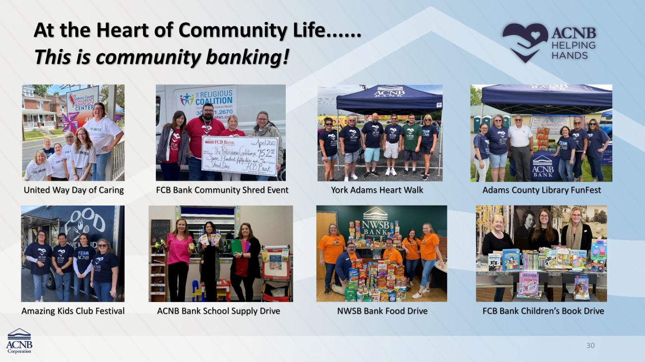 FCB Bank Community Shred Event United Way Day of Caring York Adams Heart Walk Adams County Library FunFest Amazing Kids Club Festival FCB Bank Children’s Book Drive NWSB Bank Food Drive ACNB Bank School Supply Drive At the Heart of Community Life...... This is community banking! 30