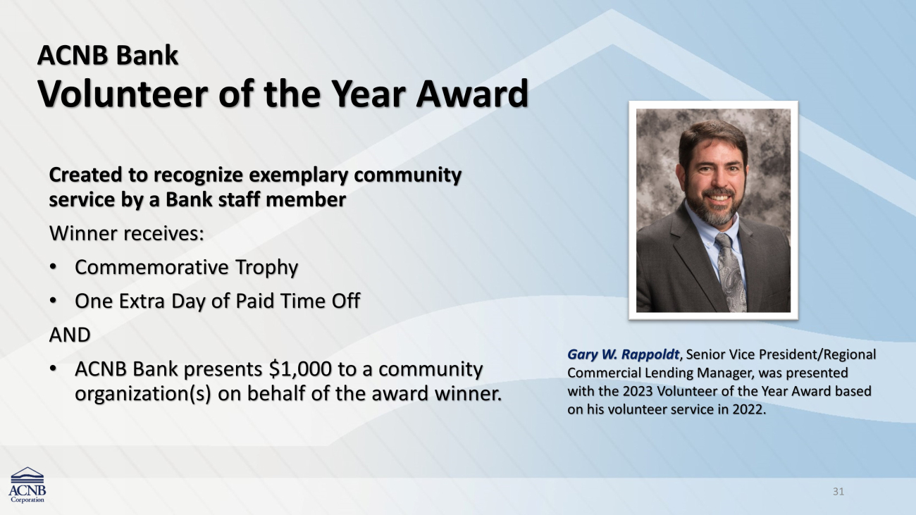 Gary W. Rappoldt , Senior Vice President/Regional Commercial Lending Manager, was presented with the 2023 Volunteer of the Year Award based on his volunteer service in 2022. ACNB Bank Volunteer of the Year Award Created to recognize exemplary community service by a Bank staff member Winner receives: • Commemorative Trophy • One Extra Day of Paid Time Off AND • ACNB Bank presents $1,000 to a community organization(s) on behalf of the award winner. 31