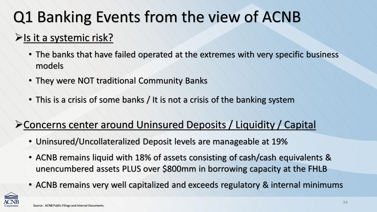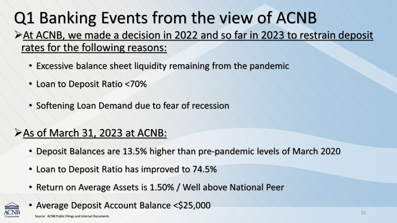 » Is it a systemic risk? • The banks that have failed operated at the extremes with very specific business models • They were NOT traditional Community Banks • This is a crisis of some banks / It is not a crisis of the banking system » Concerns center around Uninsured Deposits / Liquidity / Capital • Uninsured/Uncollateralized Deposit levels are manageable at 19% • ACNB remains liquid with 18% of assets consisting of cash/cash equivalents & unencumbered assets PLUS over $800mm in borrowing capacity at the FHLB • ACNB remains very well capitalized and exceeds regulatory & internal minimums 34 Q1 Banking Events from the view of ACNB Source: ACNB Public Filings and Internal Documents.