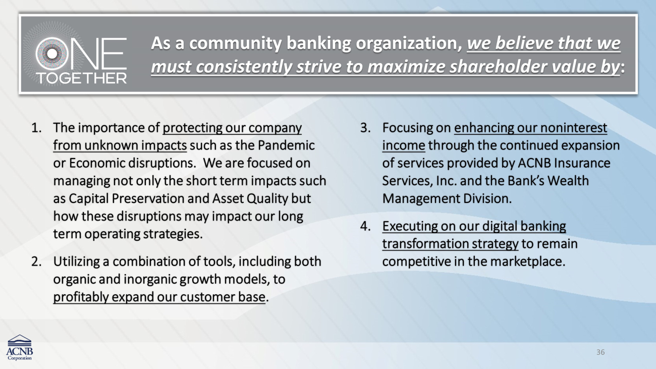 As a community banking organization, we believe that we must consistently strive to maximize shareholder value by : 36 1. The importance of protecting our company from unknown impacts such as the Pandemic or Economic disruptions. We are focused on managing not only the short term impacts such as Capital Preservation and Asset Quality but how these disruptions may impact our long term operating strategies. 2. Utilizing a combination of tools, including both organic and inorganic growth models, to profitably expand our customer base . 3. Focusing on enhancing our noninterest income through the continued expansion of services provided by ACNB Insurance Services, Inc. and the Bank’s Wealth Management Division. 4. Executing on our digital banking transformation strategy to remain competitive in the marketplace.