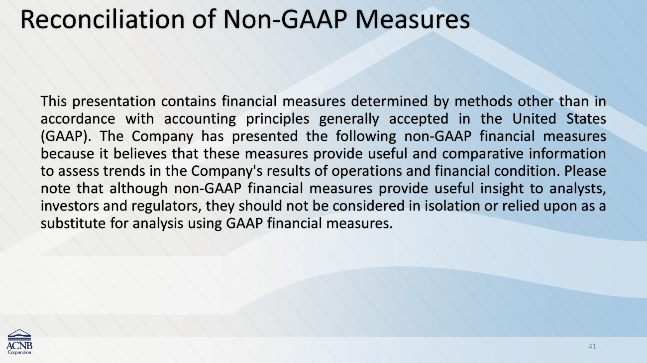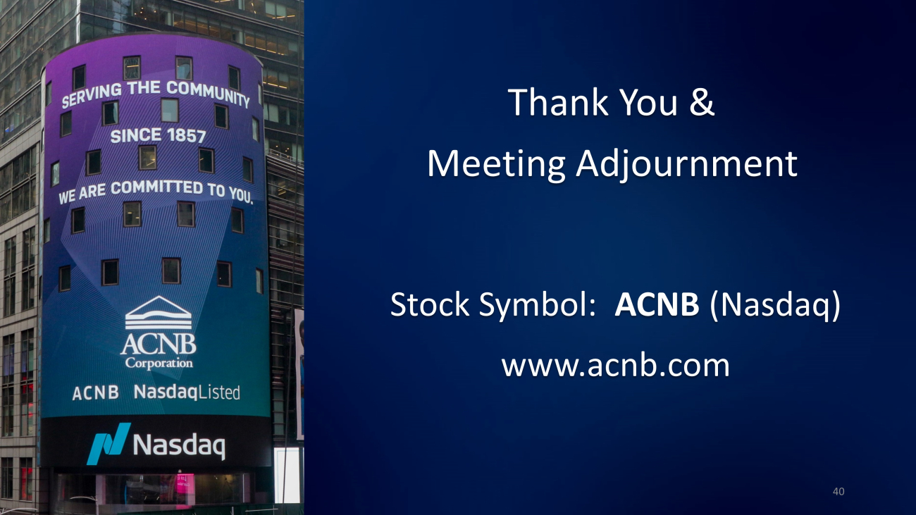 Thank You & Meeting Adjournment Stock Symbol: ACNB (Nasdaq) www.acnb.com 40