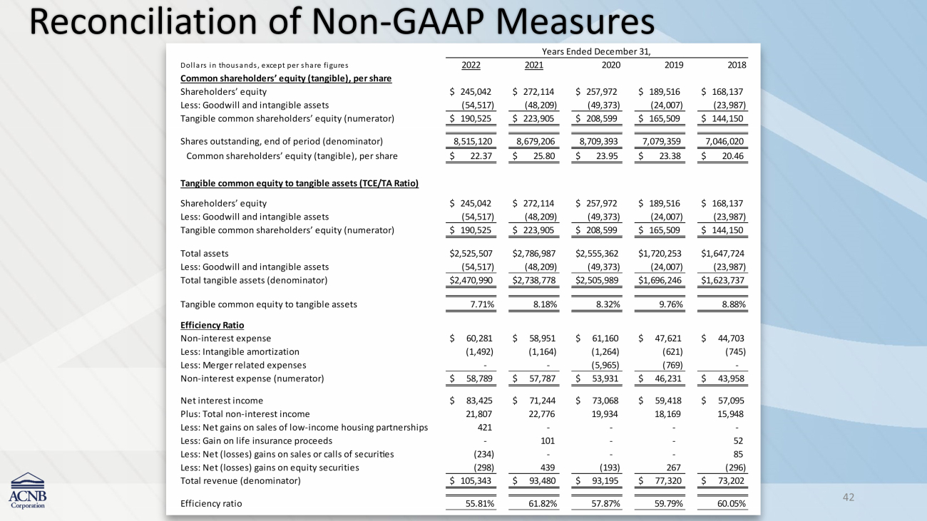42 Reconciliation of Non - GAAP Measures Dollars in thousands, except per share figures 2022 2021 2020 2019 2018 Common shareholders’ equity (tangible), per share Shareholders’ equity $ 245,042 $ 272,114 $ 257,972 $ 189,516 $ 168,137 Less: Goodwill and intangible assets (54,517) (48,209) (49,373) (24,007) (23,987) Tangible common shareholders’ equity (numerator) $ 190,525 $ 223,905 $ 208,599 $ 165,509 $ 144,150 Shares outstanding, end of period (denominator) 8,515,120 8,679,206 8,709,393 7,079,359 7,046,020 Common shareholders’ equity (tangible), per share $ 22.37 $ 25.80 $ 23.95 $ 23.38 $ 20.46 Tangible common equity to tangible assets (TCE/TA Ratio) Shareholders’ equity $ 245,042 $ 272,114 $ 257,972 $ 189,516 $ 168,137 Less: Goodwill and intangible assets (54,517) (48,209) (49,373) (24,007) (23,987) Tangible common shareholders’ equity (numerator) $ 190,525 $ 223,905 $ 208,599 $ 165,509 $ 144,150 Total assets $2,525,507 $2,786,987 $2,555,362 $1,720,253 $1,647,724 Less: Goodwill and intangible assets (54,517) (48,209) (49,373) (24,007) (23,987) Total tangible assets (denominator) $2,470,990 $2,738,778 $2,505,989 $1,696,246 $1,623,737 Tangible common equity to tangible assets 7.71% 8.18% 8.32% 9.76% 8.88% Efficiency Ratio Non-interest expense $ 60,281 $ 58,951 $ 61,160 $ 47,621 $ 44,703 Less: Intangible amortization (1,492) (1,164) (1,264) (621) (745) Less: Merger related expenses - - (5,965) (769) - Non-interest expense (numerator) $ 58,789 $ 57,787 $ 53,931 $ 46,231 $ 43,958 Net interest income $ 83,425 $ 71,244 $ 73,068 $ 59,418 $ 57,095 Plus: Total non-interest income 21,807 22,776 19,934 18,169 15,948 Less: Net gains on sales of low-income housing partnerships 421 - - - - Less: Gain on life insurance proceeds - 101 - - 52 Less: Net (losses) gains on sales or calls of securities (234) - - - 85 Less: Net (losses) gains on equity securities (298) 439 (193) 267 (296) Total revenue (denominator) $ 105,343 $ 93,480 $ 93,195 $ 77,320 $ 73,202 Efficiency ratio 55.81% 61.82% 57.87% 59.79% 60.05% Years Ended December 31,