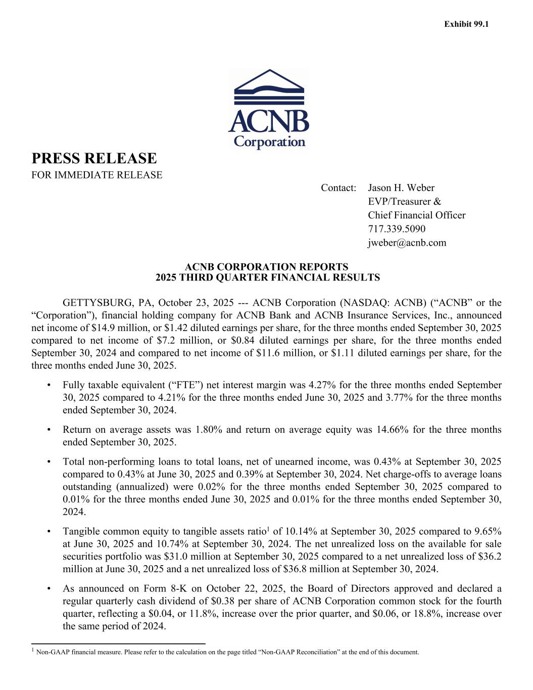 PRESS RELEASE FOR IMMEDIATE RELEASE Contact: Jason H. Weber EVP/Treasurer & Chief Financial Officer 717.339.5090 jweber@acnb.com ACNB CORPORATION REPORTS 2025 THIRD QUARTER FINANCIAL RESULTS GETTYSBURG, PA, October 23, 2025 --- ACNB Corporation (NASDAQ: ACNB) (“ACNB” or the “Corporation”), financial holding company for ACNB Bank and ACNB Insurance Services, Inc., announced net income of $14.9 million, or $1.42 diluted earnings per share, for the three months ended September 30, 2025 compared to net income of $7.2 million, or $0.84 diluted earnings per share, for the three months ended September 30, 2024 and compared to net income of $11.6 million, or $1.11 diluted earnings per share, for the three months ended June 30, 2025. • Fully taxable equivalent (“FTE”) net interest margin was 4.27% for the three months ended September 30, 2025 compared to 4.21% for the three months ended June 30, 2025 and 3.77% for the three months ended September 30, 2024. • Return on average assets was 1.80% and return on average equity was 14.66% for the three months ended September 30, 2025. • Total non-performing loans to total loans, net of unearned income, was 0.43% at September 30, 2025 compared to 0.43% at June 30, 2025 and 0.39% at September 30, 2024. Net charge-offs to average loans outstanding (annualized) were 0.02% for the three months ended September 30, 2025 compared to 0.01% for the three months ended June 30, 2025 and 0.01% for the three months ended September 30, 2024. • Tangible common equity to tangible assets ratio1 of 10.14% at September 30, 2025 compared to 9.65% at June 30, 2025 and 10.74% at September 30, 2024. The net unrealized loss on the available for sale securities portfolio was $31.0 million at September 30, 2025 compared to a net unrealized loss of $36.2 million at June 30, 2025 and a net unrealized loss of $36.8 million at September 30, 2024. • As announced on Form 8-K on October 22, 2025, the Board of Directors approved and declared a regular quarterly cash dividend of $0.38 per share of ACNB Corporation common stock for the fourth quarter, reflecting a $0.04, or 11.8%, increase over the prior quarter, and $0.06, or 18.8%, increase over the same period of 2024. Exhibit 99.1 1 Non-GAAP financial measure. Please refer to the calculation on the page titled “Non-GAAP Reconciliation” at the end of this document.