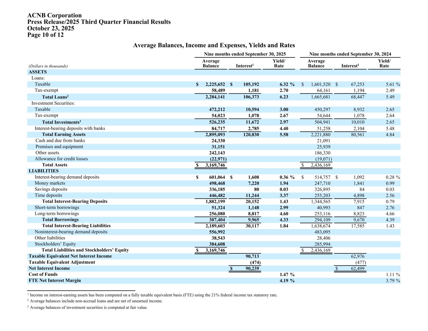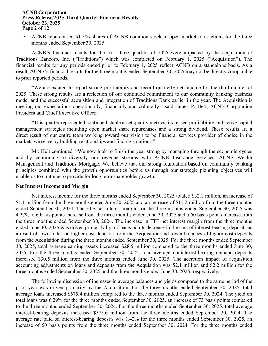 • ACNB repurchased 61,586 shares of ACNB common stock in open market transactions for the three months ended September 30, 2025. ACNB’s financial results for the first three quarters of 2025 were impacted by the acquisition of Traditions Bancorp, Inc. (“Traditions”) which was completed on February 1, 2025 (“Acquisition”). The financial results for any periods ended prior to February 1, 2025 reflect ACNB on a standalone basis. As a result, ACNB’s financial results for the three months ended September 30, 2025 may not be directly comparable to prior reported periods. “We are excited to report strong profitability and record quarterly net income for the third quarter of 2025. These strong results are a reflection of our continued commitment to our community banking business model and the successful acquisition and integration of Traditions Bank earlier in the year. The Acquisition is meeting our expectations operationally, financially and culturally.” said James P. Helt, ACNB Corporation President and Chief Executive Officer. “This quarter represented continued stable asset quality metrics, increased profitability and active capital management strategies including open market share repurchases and a strong dividend. These results are a direct result of our entire team working toward our vision to be financial services provider of choice in the markets we serve by building relationships and finding solutions.” Mr. Helt continued, “We now look to finish the year strong by managing through the economic cycles and by continuing to diversify our revenue streams with ACNB Insurance Services, ACNB Wealth Management and Traditions Mortgage. We believe that our strong foundation based on community banking principles combined with the growth opportunities before us through our strategic planning objectives will enable us to continue to provide for long term shareholder growth.” Net Interest Income and Margin Net interest income for the three months ended September 30, 2025 totaled $32.1 million, an increase of $1.1 million from the three months ended June 30, 2025 and an increase of $11.2 million from the three months ended September 30, 2024. The FTE net interest margin for the three months ended September 30, 2025 was 4.27%, a 6 basis points increase from the three months ended June 30, 2025 and a 50 basis points increase from the three months ended September 30, 2024. The increase in FTE net interest margin from the three months ended June 30, 2025 was driven primarily by a 7 basis points decrease in the cost of interest-bearing deposits as a result of lower rates on higher cost deposits from the Acquisition and lower balances of higher cost deposits from the Acquisition during the three months ended September 30, 2025. For the three months ended September 30, 2025, total average earning assets increased $28.5 million compared to the three months ended June 30, 2025. For the three months ended September 30, 2025, total average noninterest-bearing demand deposits increased $30.5 million from the three months ended June 30, 2025. The accretion impact of acquisition accounting adjustments on loans and deposits from the Acquisition was $2.1 million and $2.2 million for the three months ended September 30, 2025 and the three months ended June 30, 2025, respectively. The following discussion of increases in average balances and yields compared to the same period of the prior year was driven primarily by the Acquisition. For the three months ended September 30, 2025, total average loans increased $675.4 million compared to the three months ended September 30, 2024. The yield on total loans was 6.29% for the three months ended September 30, 2025, an increase of 73 basis points compared to the three months ended September 30, 2024. For the three months ended September 30, 2025, total average interest-bearing deposits increased $575.6 million from the three months ended September 30, 2024. The average rate paid on interest-bearing deposits was 1.42% for the three months ended September 30, 2025, an increase of 50 basis points from the three months ended September 30, 2024. For the three months ended ACNB Corporation Press Release/2025 Third Quarter Financial Results October 23, 2025 Page 2 of 12