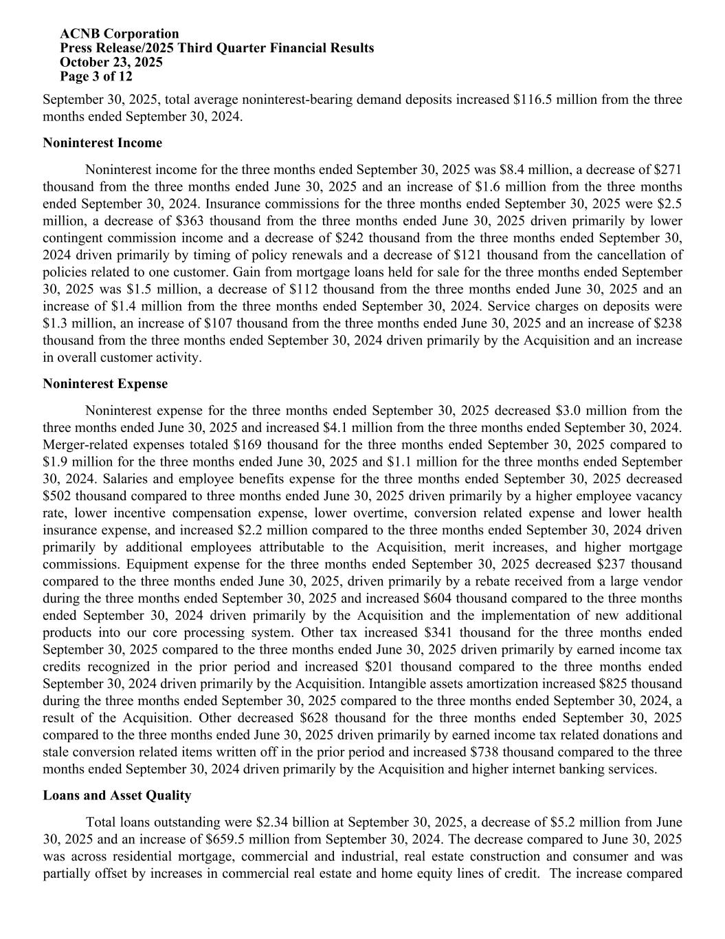 September 30, 2025, total average noninterest-bearing demand deposits increased $116.5 million from the three months ended September 30, 2024. Noninterest Income Noninterest income for the three months ended September 30, 2025 was $8.4 million, a decrease of $271 thousand from the three months ended June 30, 2025 and an increase of $1.6 million from the three months ended September 30, 2024. Insurance commissions for the three months ended September 30, 2025 were $2.5 million, a decrease of $363 thousand from the three months ended June 30, 2025 driven primarily by lower contingent commission income and a decrease of $242 thousand from the three months ended September 30, 2024 driven primarily by timing of policy renewals and a decrease of $121 thousand from the cancellation of policies related to one customer. Gain from mortgage loans held for sale for the three months ended September 30, 2025 was $1.5 million, a decrease of $112 thousand from the three months ended June 30, 2025 and an increase of $1.4 million from the three months ended September 30, 2024. Service charges on deposits were $1.3 million, an increase of $107 thousand from the three months ended June 30, 2025 and an increase of $238 thousand from the three months ended September 30, 2024 driven primarily by the Acquisition and an increase in overall customer activity. Noninterest Expense Noninterest expense for the three months ended September 30, 2025 decreased $3.0 million from the three months ended June 30, 2025 and increased $4.1 million from the three months ended September 30, 2024. Merger-related expenses totaled $169 thousand for the three months ended September 30, 2025 compared to $1.9 million for the three months ended June 30, 2025 and $1.1 million for the three months ended September 30, 2024. Salaries and employee benefits expense for the three months ended September 30, 2025 decreased $502 thousand compared to three months ended June 30, 2025 driven primarily by a higher employee vacancy rate, lower incentive compensation expense, lower overtime, conversion related expense and lower health insurance expense, and increased $2.2 million compared to the three months ended September 30, 2024 driven primarily by additional employees attributable to the Acquisition, merit increases, and higher mortgage commissions. Equipment expense for the three months ended September 30, 2025 decreased $237 thousand compared to the three months ended June 30, 2025, driven primarily by a rebate received from a large vendor during the three months ended September 30, 2025 and increased $604 thousand compared to the three months ended September 30, 2024 driven primarily by the Acquisition and the implementation of new additional products into our core processing system. Other tax increased $341 thousand for the three months ended September 30, 2025 compared to the three months ended June 30, 2025 driven primarily by earned income tax credits recognized in the prior period and increased $201 thousand compared to the three months ended September 30, 2024 driven primarily by the Acquisition. Intangible assets amortization increased $825 thousand during the three months ended September 30, 2025 compared to the three months ended September 30, 2024, a result of the Acquisition. Other decreased $628 thousand for the three months ended September 30, 2025 compared to the three months ended June 30, 2025 driven primarily by earned income tax related donations and stale conversion related items written off in the prior period and increased $738 thousand compared to the three months ended September 30, 2024 driven primarily by the Acquisition and higher internet banking services. Loans and Asset Quality Total loans outstanding were $2.34 billion at September 30, 2025, a decrease of $5.2 million from June 30, 2025 and an increase of $659.5 million from September 30, 2024. The decrease compared to June 30, 2025 was across residential mortgage, commercial and industrial, real estate construction and consumer and was partially offset by increases in commercial real estate and home equity lines of credit. The increase compared ACNB Corporation Press Release/2025 Third Quarter Financial Results October 23, 2025 Page 3 of 12