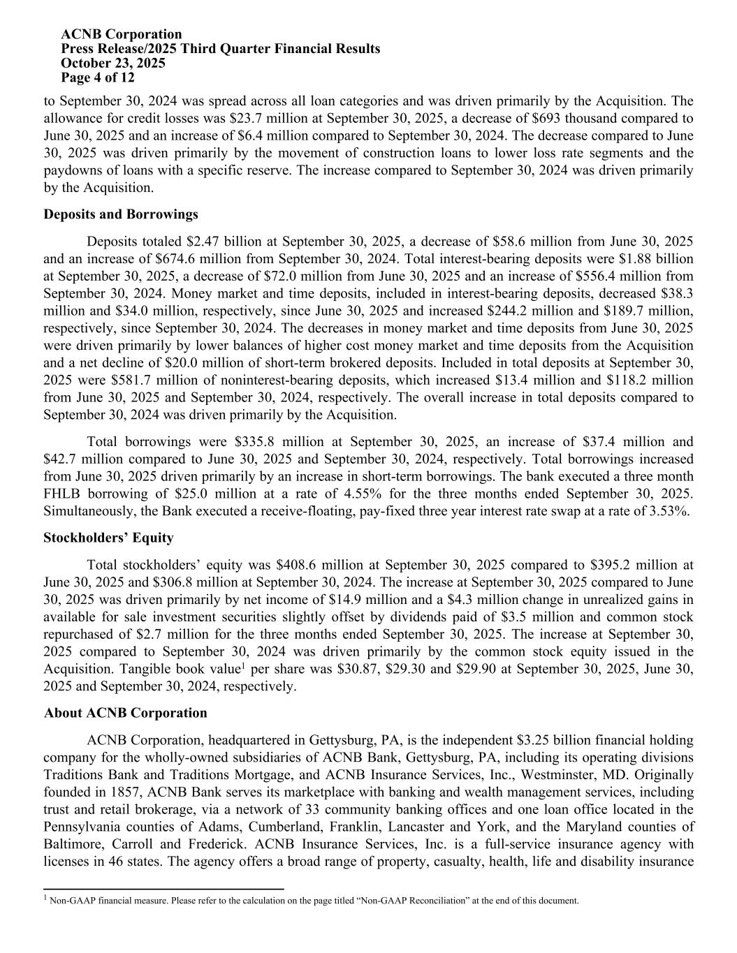 to September 30, 2024 was spread across all loan categories and was driven primarily by the Acquisition. The allowance for credit losses was $23.7 million at September 30, 2025, a decrease of $693 thousand compared to June 30, 2025 and an increase of $6.4 million compared to September 30, 2024. The decrease compared to June 30, 2025 was driven primarily by the movement of construction loans to lower loss rate segments and the paydowns of loans with a specific reserve. The increase compared to September 30, 2024 was driven primarily by the Acquisition. Deposits and Borrowings Deposits totaled $2.47 billion at September 30, 2025, a decrease of $58.6 million from June 30, 2025 and an increase of $674.6 million from September 30, 2024. Total interest-bearing deposits were $1.88 billion at September 30, 2025, a decrease of $72.0 million from June 30, 2025 and an increase of $556.4 million from September 30, 2024. Money market and time deposits, included in interest-bearing deposits, decreased $38.3 million and $34.0 million, respectively, since June 30, 2025 and increased $244.2 million and $189.7 million, respectively, since September 30, 2024. The decreases in money market and time deposits from June 30, 2025 were driven primarily by lower balances of higher cost money market and time deposits from the Acquisition and a net decline of $20.0 million of short-term brokered deposits. Included in total deposits at September 30, 2025 were $581.7 million of noninterest-bearing deposits, which increased $13.4 million and $118.2 million from June 30, 2025 and September 30, 2024, respectively. The overall increase in total deposits compared to September 30, 2024 was driven primarily by the Acquisition. Total borrowings were $335.8 million at September 30, 2025, an increase of $37.4 million and $42.7 million compared to June 30, 2025 and September 30, 2024, respectively. Total borrowings increased from June 30, 2025 driven primarily by an increase in short-term borrowings. The bank executed a three month FHLB borrowing of $25.0 million at a rate of 4.55% for the three months ended September 30, 2025. Simultaneously, the Bank executed a receive-floating, pay-fixed three year interest rate swap at a rate of 3.53%. Stockholders’ Equity Total stockholders’ equity was $408.6 million at September 30, 2025 compared to $395.2 million at June 30, 2025 and $306.8 million at September 30, 2024. The increase at September 30, 2025 compared to June 30, 2025 was driven primarily by net income of $14.9 million and a $4.3 million change in unrealized gains in available for sale investment securities slightly offset by dividends paid of $3.5 million and common stock repurchased of $2.7 million for the three months ended September 30, 2025. The increase at September 30, 2025 compared to September 30, 2024 was driven primarily by the common stock equity issued in the Acquisition. Tangible book value1 per share was $30.87, $29.30 and $29.90 at September 30, 2025, June 30, 2025 and September 30, 2024, respectively. About ACNB Corporation ACNB Corporation, headquartered in Gettysburg, PA, is the independent $3.25 billion financial holding company for the wholly-owned subsidiaries of ACNB Bank, Gettysburg, PA, including its operating divisions Traditions Bank and Traditions Mortgage, and ACNB Insurance Services, Inc., Westminster, MD. Originally founded in 1857, ACNB Bank serves its marketplace with banking and wealth management services, including trust and retail brokerage, via a network of 33 community banking offices and one loan office located in the Pennsylvania counties of Adams, Cumberland, Franklin, Lancaster and York, and the Maryland counties of Baltimore, Carroll and Frederick. ACNB Insurance Services, Inc. is a full-service insurance agency with licenses in 46 states. The agency offers a broad range of property, casualty, health, life and disability insurance ACNB Corporation Press Release/2025 Third Quarter Financial Results October 23, 2025 Page 4 of 12 1 Non-GAAP financial measure. Please refer to the calculation on the page titled “Non-GAAP Reconciliation” at the end of this document.