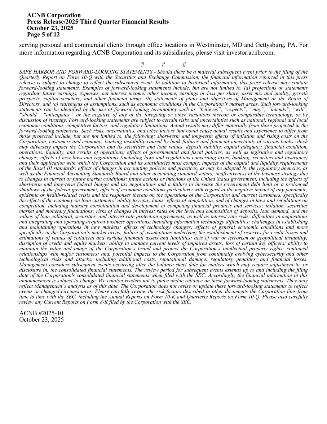 serving personal and commercial clients through office locations in Westminster, MD and Gettysburg, PA. For more information regarding ACNB Corporation and its subsidiaries, please visit investor.acnb.com. # # # SAFE HARBOR AND FORWARD-LOOKING STATEMENTS - Should there be a material subsequent event prior to the filing of the Quarterly Report on Form 10-Q with the Securities and Exchange Commission, the financial information reported in this press release is subject to change to reflect the subsequent event. In addition to historical information, this press release may contain forward-looking statements. Examples of forward-looking statements include, but are not limited to, (a) projections or statements regarding future earnings, expenses, net interest income, other income, earnings or loss per share, asset mix and quality, growth prospects, capital structure, and other financial terms, (b) statements of plans and objectives of Management or the Board of Directors, and (c) statements of assumptions, such as economic conditions in the Corporation’s market areas. Such forward-looking statements can be identified by the use of forward-looking terminology such as “believes”, “expects”, “may”, “intends”, “will”, “should”, “anticipates”, or the negative of any of the foregoing or other variations thereon or comparable terminology, or by discussion of strategy. Forward-looking statements are subject to certain risks and uncertainties such as national, regional and local economic conditions, competitive factors, and regulatory limitations. Actual results may differ materially from those projected in the forward-looking statements. Such risks, uncertainties, and other factors that could cause actual results and experience to differ from those projected include, but are not limited to, the following: short-term and long-term effects of inflation and rising costs on the Corporation, customers and economy; banking instability caused by bank failures and financial uncertainty of various banks which may adversely impact the Corporation and its securities and loan values, deposit stability, capital adequacy, financial condition, operations, liquidity, and results of operations; effects of governmental and fiscal policies, as well as legislative and regulatory changes; effects of new laws and regulations (including laws and regulations concerning taxes, banking, securities and insurance) and their application with which the Corporation and its subsidiaries must comply; impacts of the capital and liquidity requirements of the Basel III standards; effects of changes in accounting policies and practices, as may be adopted by the regulatory agencies, as well as the Financial Accounting Standards Board and other accounting standard setters; ineffectiveness of the business strategy due to changes in current or future market conditions; future actions or inactions of the United States government, including the effects of short-term and long-term federal budget and tax negotiations and a failure to increase the government debt limit or a prolonged shutdown of the federal government; effects of economic conditions particularly with regard to the negative impact of any pandemic, epidemic or health-related crisis and the responses thereto on the operations of the Corporation and current customers, specifically the effect of the economy on loan customers’ ability to repay loans; effects of competition, and of changes in laws and regulations on competition, including industry consolidation and development of competing financial products and services; inflation, securities market and monetary fluctuations; risks of changes in interest rates on the level and composition of deposits, loan demand, and the values of loan collateral, securities, and interest rate protection agreements, as well as interest rate risks; difficulties in acquisitions and integrating and operating acquired business operations, including information technology difficulties; challenges in establishing and maintaining operations in new markets; effects of technology changes; effects of general economic conditions and more specifically in the Corporation’s market areas; failure of assumptions underlying the establishment of reserves for credit losses and estimations of values of collateral and various financial assets and liabilities; acts of war or terrorism or geopolitical instability; disruption of credit and equity markets; ability to manage current levels of impaired assets; loss of certain key officers; ability to maintain the value and image of the Corporation’s brand and protect the Corporation’s intellectual property rights; continued relationships with major customers; and, potential impacts to the Corporation from continually evolving cybersecurity and other technological risks and attacks, including additional costs, reputational damage, regulatory penalties, and financial losses. Management considers subsequent events occurring after the balance sheet date for matters which may require adjustment to, or disclosure in, the consolidated financial statements. The review period for subsequent events extends up to and including the filing date of the Corporation's consolidated financial statements when filed with the SEC. Accordingly, the financial information in this announcement is subject to change. We caution readers not to place undue reliance on these forward-looking statements. They only reflect Management’s analysis as of this date. The Corporation does not revise or update these forward-looking statements to reflect events or changed circumstances. Please carefully review the risk factors described in other documents the Corporation files from time to time with the SEC, including the Annual Reports on Form 10-K and Quarterly Reports on Form 10-Q. Please also carefully review any Current Reports on Form 8-K filed by the Corporation with the SEC. ACNB #2025-10 October 23, 2025 ACNB Corporation