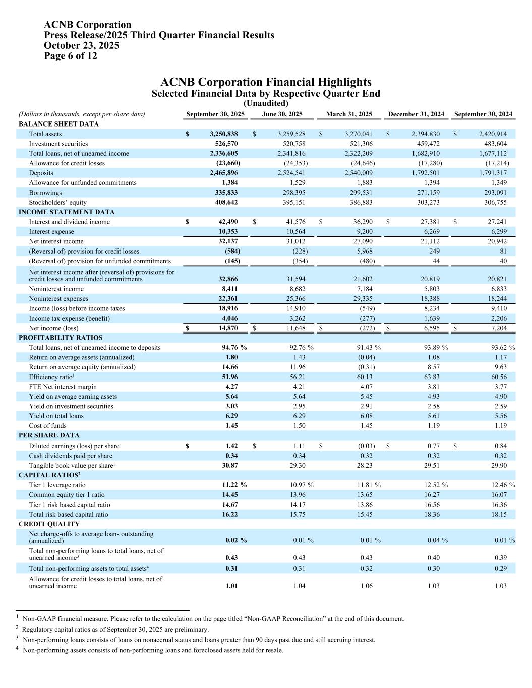 ACNB Corporation Financial Highlights Selected Financial Data by Respective Quarter End (Unaudited) (Dollars in thousands, except per share data) September 30, 2025 June 30, 2025 March 31, 2025 December 31, 2024 September 30, 2024 BALANCE SHEET DATA Total assets $ 3,250,838 $ 3,259,528 $ 3,270,041 $ 2,394,830 $ 2,420,914 Investment securities 526,570 520,758 521,306 459,472 483,604 Total loans, net of unearned income 2,336,605 2,341,816 2,322,209 1,682,910 1,677,112 Allowance for credit losses (23,660) (24,353) (24,646) (17,280) (17,214) Deposits 2,465,896 2,524,541 2,540,009 1,792,501 1,791,317 Allowance for unfunded commitments 1,384 1,529 1,883 1,394 1,349 Borrowings 335,833 298,395 299,531 271,159 293,091 Stockholders’ equity 408,642 395,151 386,883 303,273 306,755 INCOME STATEMENT DATA Interest and dividend income $ 42,490 $ 41,576 $ 36,290 $ 27,381 $ 27,241 Interest expense 10,353 10,564 9,200 6,269 6,299 Net interest income 32,137 31,012 27,090 21,112 20,942 (Reversal of) provision for credit losses (584) (228) 5,968 249 81 (Reversal of) provision for unfunded commitments (145) (354) (480) 44 40 Net interest income after (reversal of) provisions for credit losses and unfunded commitments 32,866 31,594 21,602 20,819 20,821 Noninterest income 8,411 8,682 7,184 5,803 6,833 Noninterest expenses 22,361 25,366 29,335 18,388 18,244 Income (loss) before income taxes 18,916 14,910 (549) 8,234 9,410 Income tax expense (benefit) 4,046 3,262 (277) 1,639 2,206 Net income (loss) $ 14,870 $ 11,648 $ (272) $ 6,595 $ 7,204 PROFITABILITY RATIOS Total loans, net of unearned income to deposits 94.76 % 92.76 % 91.43 % 93.89 % 93.62 % Return on average assets (annualized) 1.80 1.43 (0.04) 1.08 1.17 Return on average equity (annualized) 14.66 11.96 (0.31) 8.57 9.63 Efficiency ratio1 51.96 56.21 60.13 63.83 60.56 FTE Net interest margin 4.27 4.21 4.07 3.81 3.77 Yield on average earning assets 5.64 5.64 5.45 4.93 4.90 Yield on investment securities 3.03 2.95 2.91 2.58 2.59 Yield on total loans 6.29 6.29 6.08 5.61 5.56 Cost of funds 1.45 1.50 1.45 1.19 1.19 PER SHARE DATA Diluted earnings (loss) per share $ 1.42 $ 1.11 $ (0.03) $ 0.77 $ 0.84 Cash dividends paid per share 0.34 0.34 0.32 0.32 0.32 Tangible book value per share1 30.87 29.30 28.23 29.51 29.90 CAPITAL RATIOS2 Tier 1 leverage ratio 11.22 % 10.97 % 11.81 % 12.52 % 12.46 % Common equity tier 1 ratio 14.45 13.96 13.65 16.27 16.07 Tier 1 risk based capital ratio 14.67 14.17 13.86 16.56 16.36 Total risk based capital ratio 16.22 15.75 15.45 18.36 18.15 CREDIT QUALITY Net charge-offs to average loans outstanding (annualized) 0.02 % 0.01 % 0.01 % 0.04 % 0.01 % Total non-performing loans to total loans, net of unearned income3 0.43 0.43 0.43 0.40 0.39 Total non-performing assets to total assets4 0.31 0.31 0.32 0.30 0.29 Allowance for credit losses to total loans, net of unearned income 1.01 1.04 1.06 1.03 1.03 ACNB Corporation Press Release/2025 Third Quarter Financial Results October 23, 2025 Page 6 of 12 1 Non-GAAP financial measure. Please refer to the calculation on the page titled “Non-GAAP Reconciliation” at the end of this document. 2 Regulatory capital ratios as of September 30, 2025 are preliminary. 3 Non-performing loans consists of loans on nonaccrual status and loans greater than 90 days past due and still accruing interest. 4 Non-performing assets consists of non-performing loans and foreclosed assets held for resale.