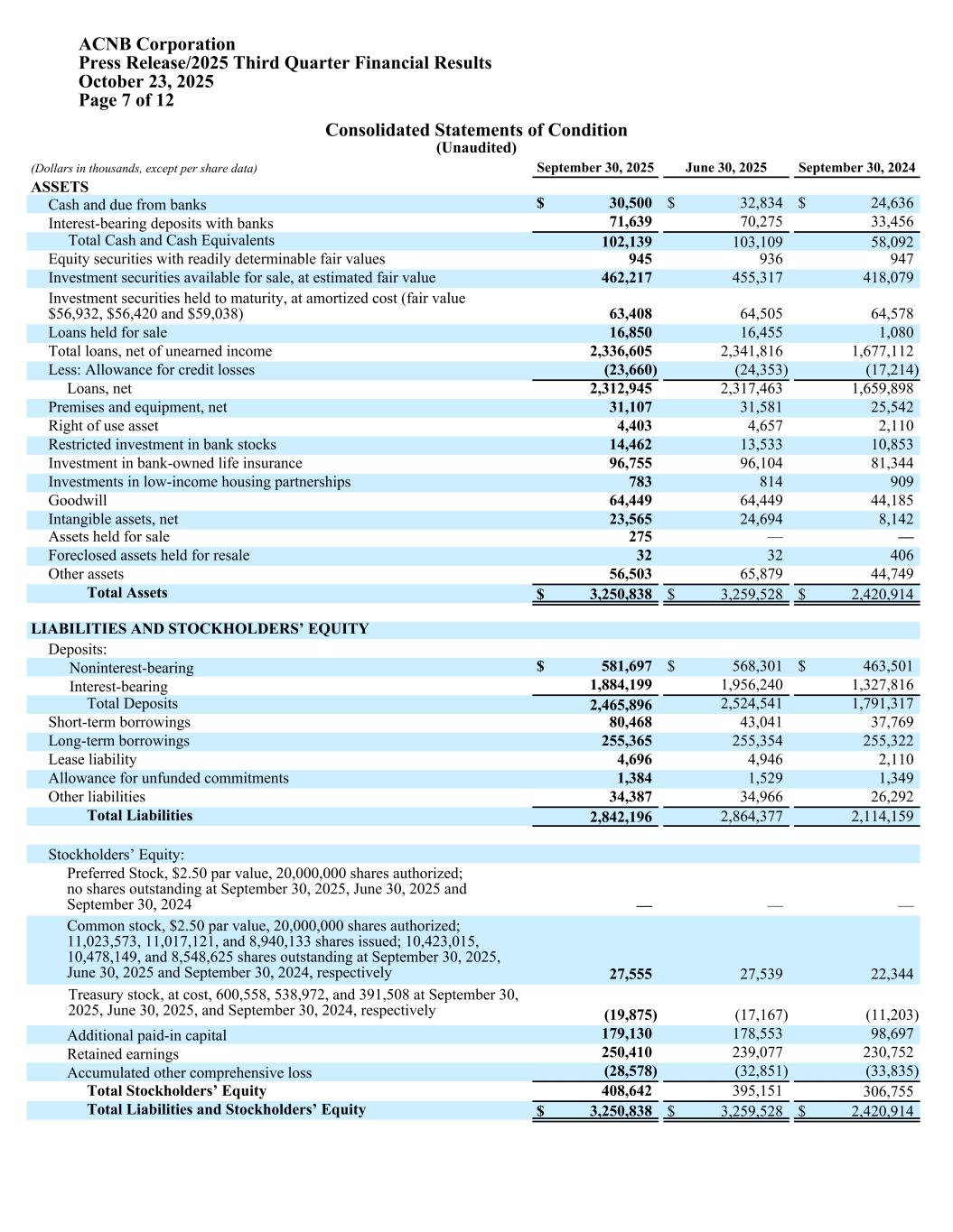 Consolidated Statements of Condition (Unaudited) (Dollars in thousands, except per share data) September 30, 2025 June 30, 2025 September 30, 2024 ASSETS Cash and due from banks $ 30,500 $ 32,834 $ 24,636 Interest-bearing deposits with banks 71,639 70,275 33,456 Total Cash and Cash Equivalents 102,139 103,109 58,092 Equity securities with readily determinable fair values 945 936 947 Investment securities available for sale, at estimated fair value 462,217 455,317 418,079 Investment securities held to maturity, at amortized cost (fair value $56,932, $56,420 and $59,038) 63,408 64,505 64,578 Loans held for sale 16,850 16,455 1,080 Total loans, net of unearned income 2,336,605 2,341,816 1,677,112 Less: Allowance for credit losses (23,660) (24,353) (17,214) Loans, net 2,312,945 2,317,463 1,659,898 Premises and equipment, net 31,107 31,581 25,542 Right of use asset 4,403 4,657 2,110 Restricted investment in bank stocks 14,462 13,533 10,853 Investment in bank-owned life insurance 96,755 96,104 81,344 Investments in low-income housing partnerships 783 814 909 Goodwill 64,449 64,449 44,185 Intangible assets, net 23,565 24,694 8,142 Assets held for sale 275 — — Foreclosed assets held for resale 32 32 406 Other assets 56,503 65,879 44,749 Total Assets $ 3,250,838 $ 3,259,528 $ 2,420,914 LIABILITIES AND STOCKHOLDERS’ EQUITY Deposits: Noninterest-bearing $ 581,697 $ 568,301 $ 463,501 Interest-bearing 1,884,199 1,956,240 1,327,816 Total Deposits 2,465,896 2,524,541 1,791,317 Short-term borrowings 80,468 43,041 37,769 Long-term borrowings 255,365 255,354 255,322 Lease liability 4,696 4,946 2,110 Allowance for unfunded commitments 1,384 1,529 1,349 Other liabilities 34,387 34,966 26,292 Total Liabilities 2,842,196 2,864,377 2,114,159 Stockholders’ Equity: Preferred Stock, $2.50 par value, 20,000,000 shares authorized; no shares outstanding at September 30, 2025, June 30, 2025 and September 30, 2024 — — — Common stock, $2.50 par value, 20,000,000 shares authorized; 11,023,573, 11,017,121, and 8,940,133 shares issued; 10,423,015, 10,478,149, and 8,548,625 shares outstanding at September 30, 2025, June 30, 2025 and September 30, 2024, respectively 27,555 27,539 22,344 Treasury stock, at cost, 600,558, 538,972, and 391,508 at September 30, 2025, June 30, 2025, and September 30, 2024, respectively (19,875) (17,167) (11,203) Additional paid-in capital 179,130 178,553 98,697 Retained earnings 250,410 239,077 230,752 Accumulated other comprehensive loss (28,578) (32,851) (33,835) Total Stockholders’ Equity 408,642 395,151 306,755 Total Liabilities and Stockholders’ Equity $ 3,250,838 $ 3,259,528 $ 2,420,914 ACNB Corporation Press Release/2025 Third Quarter Financial Results October 23, 2025 Page 7 of 12