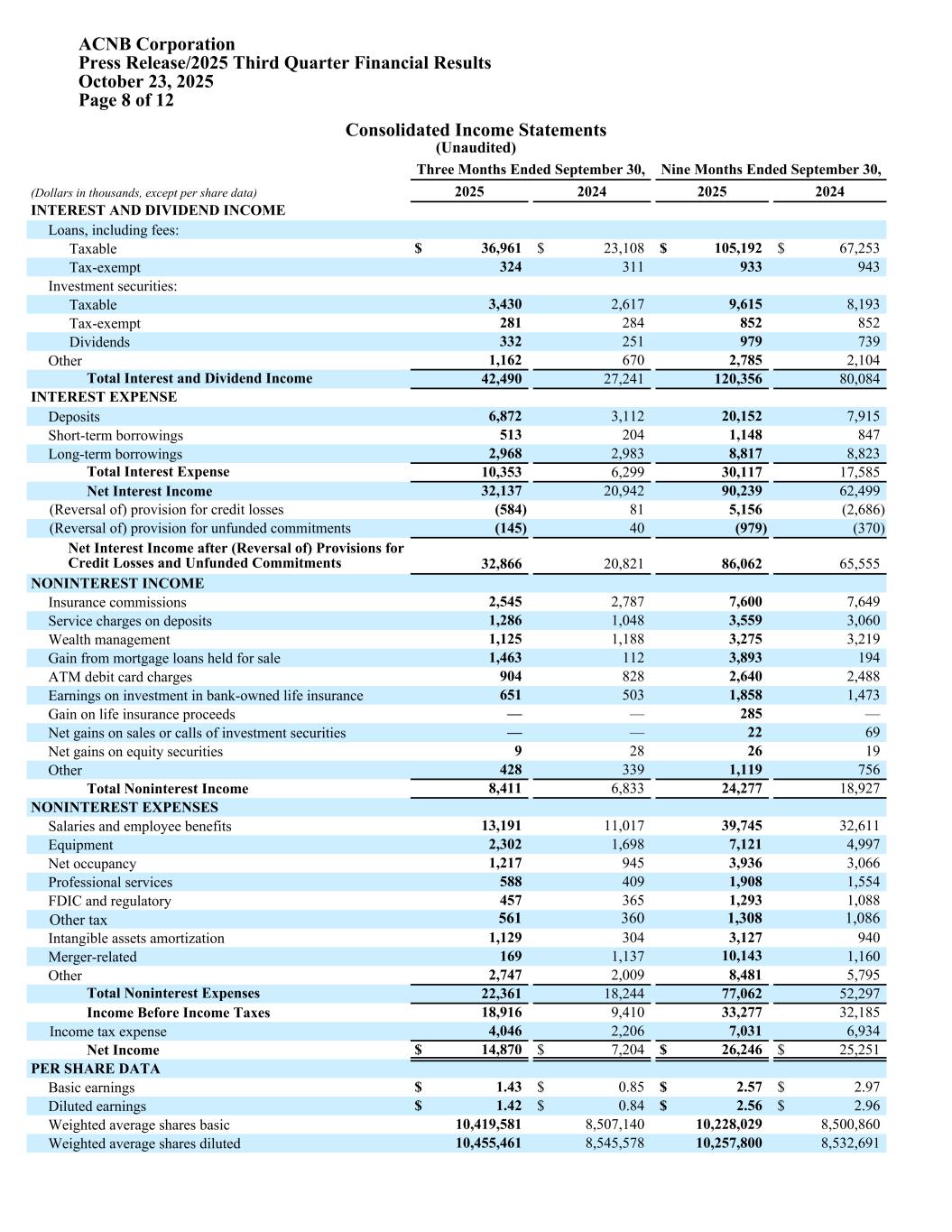 Consolidated Income Statements (Unaudited) Three Months Ended September 30, Nine Months Ended September 30, (Dollars in thousands, except per share data) 2025 2024 2025 2024 INTEREST AND DIVIDEND INCOME Loans, including fees: Taxable $ 36,961 $ 23,108 $ 105,192 $ 67,253 Tax-exempt 324 311 933 943 Investment securities: Taxable 3,430 2,617 9,615 8,193 Tax-exempt 281 284 852 852 Dividends 332 251 979 739 Other 1,162 670 2,785 2,104 Total Interest and Dividend Income 42,490 27,241 120,356 80,084 INTEREST EXPENSE Deposits 6,872 3,112 20,152 7,915 Short-term borrowings 513 204 1,148 847 Long-term borrowings 2,968 2,983 8,817 8,823 Total Interest Expense 10,353 6,299 30,117 17,585 Net Interest Income 32,137 20,942 90,239 62,499 (Reversal of) provision for credit losses (584) 81 5,156 (2,686) (Reversal of) provision for unfunded commitments (145) 40 (979) (370) Net Interest Income after (Reversal of) Provisions for Credit Losses and Unfunded Commitments 32,866 20,821 86,062 65,555 NONINTEREST INCOME Insurance commissions 2,545 2,787 7,600 7,649 Service charges on deposits 1,286 1,048 3,559 3,060 Wealth management 1,125 1,188 3,275 3,219 Gain from mortgage loans held for sale 1,463 112 3,893 194 ATM debit card charges 904 828 2,640 2,488 Earnings on investment in bank-owned life insurance 651 503 1,858 1,473 Gain on life insurance proceeds — — 285 — Net gains on sales or calls of investment securities — — 22 69 Net gains on equity securities 9 28 26 19 Other 428 339 1,119 756 Total Noninterest Income 8,411 6,833 24,277 18,927 NONINTEREST EXPENSES Salaries and employee benefits 13,191 11,017 39,745 32,611 Equipment 2,302 1,698 7,121 4,997 Net occupancy 1,217 945 3,936 3,066 Professional services 588 409 1,908 1,554 FDIC and regulatory 457 365 1,293 1,088 Other tax 561 360 1,308 1,086 Intangible assets amortization 1,129 304 3,127 940 Merger-related 169 1,137 10,143 1,160 Other 2,747 2,009 8,481 5,795 Total Noninterest Expenses 22,361 18,244 77,062 52,297 Income Before Income Taxes 18,916 9,410 33,277 32,185 Income tax expense 4,046 2,206 7,031 6,934 Net Income $ 14,870 $ 7,204 $ 26,246 $ 25,251 PER SHARE DATA Basic earnings $ 1.43 $ 0.85 $ 2.57 $ 2.97 Diluted earnings $ 1.42 $ 0.84 $ 2.56 $ 2.96 Weighted average shares basic 10,419,581 8,507,140 10,228,029 8,500,860 Weighted average shares diluted 10,455,461 8,545,578 10,257,800 8,532,691 ACNB Corporation Press Release/2025 Third Quarter Financial Results October 23, 2025 Page 8 of 12
