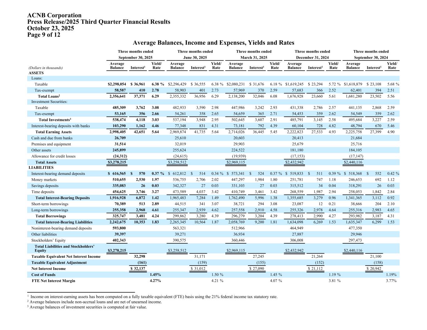 Average Balances, Income and Expenses, Yields and Rates Three months ended Three months ended Three months ended Three months ended Three months ended September 30, 2025 June 30, 2025 March 31, 2025 December 31, 2024 September 30, 2024 (Dollars in thousands) Average Balance Interest1 Yield/ Rate Average Balance Interest1 Yield/ Rate Average Balance Interest1 Yield/ Rate Average Balance Interest1 Yield/ Rate Average Balance Interest1 Yield/ Rate ASSETS Loans: Taxable $ 2,298,054 $ 36,961 6.38 % $ 2,296,429 $ 36,555 6.38 % $ 2,080,231 $ 31,676 6.18 % $ 1,619,245 $ 23,294 5.72 % $ 1,618,879 $ 23,108 5.68 % Tax-exempt 58,587 410 2.78 58,903 401 2.73 57,969 370 2.59 57,683 366 2.52 62,401 394 2.51 Total Loans2 2,356,641 37,371 6.29 2,355,332 36,956 6.29 2,138,200 32,046 6.08 1,676,928 23,660 5.61 1,681,280 23,502 5.56 Investment Securities: Taxable 485,309 3,762 3.08 482,933 3,590 2.98 447,986 3,242 2.93 431,338 2,786 2.57 441,135 2,868 2.59 Tax-exempt 53,165 356 2.66 54,261 358 2.65 54,659 365 2.71 54,453 359 2.62 54,549 359 2.62 Total Investments3 538,474 4,118 3.03 537,194 3,948 2.95 502,645 3,607 2.91 485,791 3,145 2.58 495,684 3,227 2.59 Interest-bearing deposits with banks 103,290 1,162 4.46 77,348 831 4.31 73,181 792 4.39 60,104 728 4.82 48,794 670 5.46 Total Earning Assets 2,998,405 42,651 5.64 2,969,874 41,735 5.64 2,714,026 36,445 5.45 2,222,823 27,533 4.93 2,225,758 27,399 4.90 Cash and due from banks 26,709 25,610 20,603 20,413 21,684 Premises and equipment 31,514 32,019 29,903 25,679 25,716 Other assets 245,899 255,624 224,522 181,180 184,105 Allowance for credit losses (24,312) (24,615) (19,939) (17,153) (17,147) Total Assets $ 3,278,215 $ 3,258,512 $ 2,969,115 $ 2,432,942 $ 2,440,116 LIABILITIES Interest-bearing demand deposits $ 616,565 $ 570 0.37 % $ 612,812 $ 514 0.34 % $ 573,341 $ 524 0.37 % $ 519,833 $ 511 0.39 % $ 518,368 $ 552 0.42 % Money markets 510,655 2,530 1.97 536,755 2,706 2.02 447,297 1,984 1.80 251,781 747 1.18 246,653 692 1.12 Savings deposits 335,083 26 0.03 342,327 27 0.03 331,103 27 0.03 315,512 34 0.04 318,291 26 0.03 Time deposits 454,625 3,746 3.27 473,589 4,037 3.42 410,749 3,461 3.42 268,559 1,987 2.94 258,053 1,842 2.84 Total Interest-Bearing Deposits 1,916,928 6,872 1.42 1,965,483 7,284 1.49 1,762,490 5,996 1.38 1,355,685 3,279 0.96 1,341,365 3,112 0.92 Short-term borrowings 70,389 513 2.89 44,515 341 3.07 38,721 294 3.08 23,087 12 0.21 38,666 204 2.10 Long-term borrowings 255,358 2,968 4.61 255,347 2,939 4.62 257,558 2,910 4.58 255,326 2,978 4.64 255,316 2,983 4.65 Total Borrowings 325,747 3,481 4.24 299,862 3,280 4.39 296,279 3,204 4.39 278,413 2,990 4.27 293,982 3,187 4.31 Total Interest-Bearing Liabilities 2,242,675 10,353 1.83 2,265,345 10,564 1.87 2,058,769 9,200 1.81 1,634,098 6,269 1.53 1,635,347 6,299 1.53 Noninterest-bearing demand deposits 593,800 563,321 512,966 464,949 477,350 Other liabilities 39,397 39,271 36,934 27,887 29,946 Stockholders’ Equity 402,343 390,575 360,446 306,008 297,473 Total Liabilities and Stockholders’ Equity $ 3,278,215 $ 3,258,512 $ 2,969,115 $ 2,432,942 $ 2,440,116 Taxable Equivalent Net Interest Income 32,298 31,171 27,245 21,264 21,100 Taxable Equivalent Adjustment (161) (159) (155) (152) (158) Net Interest Income $ 32,137 $ 31,012 $ 27,090 $ 21,112 $ 20,942 Cost of Funds 1.45% 1.50 % 1.45 % 1.19 % 1.19% FTE Net Interest Margin 4.27% 4.21 % 4.07 % 3.81 % 3.77% ACNB Corporation Press Release/2025 Third Quarter Financial Results October 23, 2025 Page 9 of 12 1 Income on interest-earning assets has been computed on a fully taxable equivalent (FTE) basis using the 21% federal income tax statutory rate. 2 Average balances include non-accrual loans and are net of unearned income. 3 Average balances of investment securities is computed at fair value.