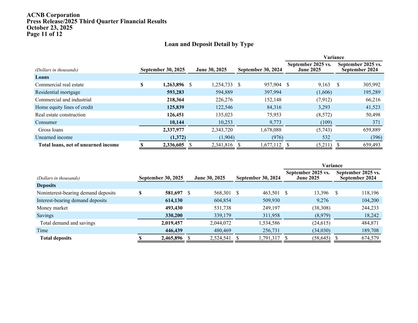 Loan and Deposit Detail by Type Variance (Dollars in thousands) September 30, 2025 June 30, 2025 September 30, 2024 September 2025 vs. June 2025 September 2025 vs. September 2024 Loans Commercial real estate $ 1,263,896 $ 1,254,733 $ 957,904 $ 9,163 $ 305,992 Residential mortgage 593,283 594,889 397,994 (1,606) 195,289 Commercial and industrial 218,364 226,276 152,148 (7,912) 66,216 Home equity lines of credit 125,839 122,546 84,316 3,293 41,523 Real estate construction 126,451 135,023 75,953 (8,572) 50,498 Consumer 10,144 10,253 9,773 (109) 371 Gross loans 2,337,977 2,343,720 1,678,088 (5,743) 659,889 Unearned income (1,372) (1,904) (976) 532 (396) Total loans, net of unearned income $ 2,336,605 $ 2,341,816 $ 1,677,112 $ (5,211) $ 659,493 Variance (Dollars in thousands) September 30, 2025 June 30, 2025 September 30, 2024 September 2025 vs. June 2025 September 2025 vs. September 2024 Deposits Noninterest-bearing demand deposits $ 581,697 $ 568,301 $ 463,501 $ 13,396 $ 118,196 Interest-bearing demand deposits 614,130 604,854 509,930 9,276 104,200 Money market 493,430 531,738 249,197 (38,308) 244,233 Savings 330,200 339,179 311,958 (8,979) 18,242 Total demand and savings 2,019,457 2,044,072 1,534,586 (24,615) 484,871 Time 446,439 480,469 256,731 (34,030) 189,708 Total deposits $ 2,465,896 $ 2,524,541 $ 1,791,317 $ (58,645) $ 674,579 ACNB Corporation Press Release/2025 Third Quarter Financial Results October 23, 2025 Page 11 of 12