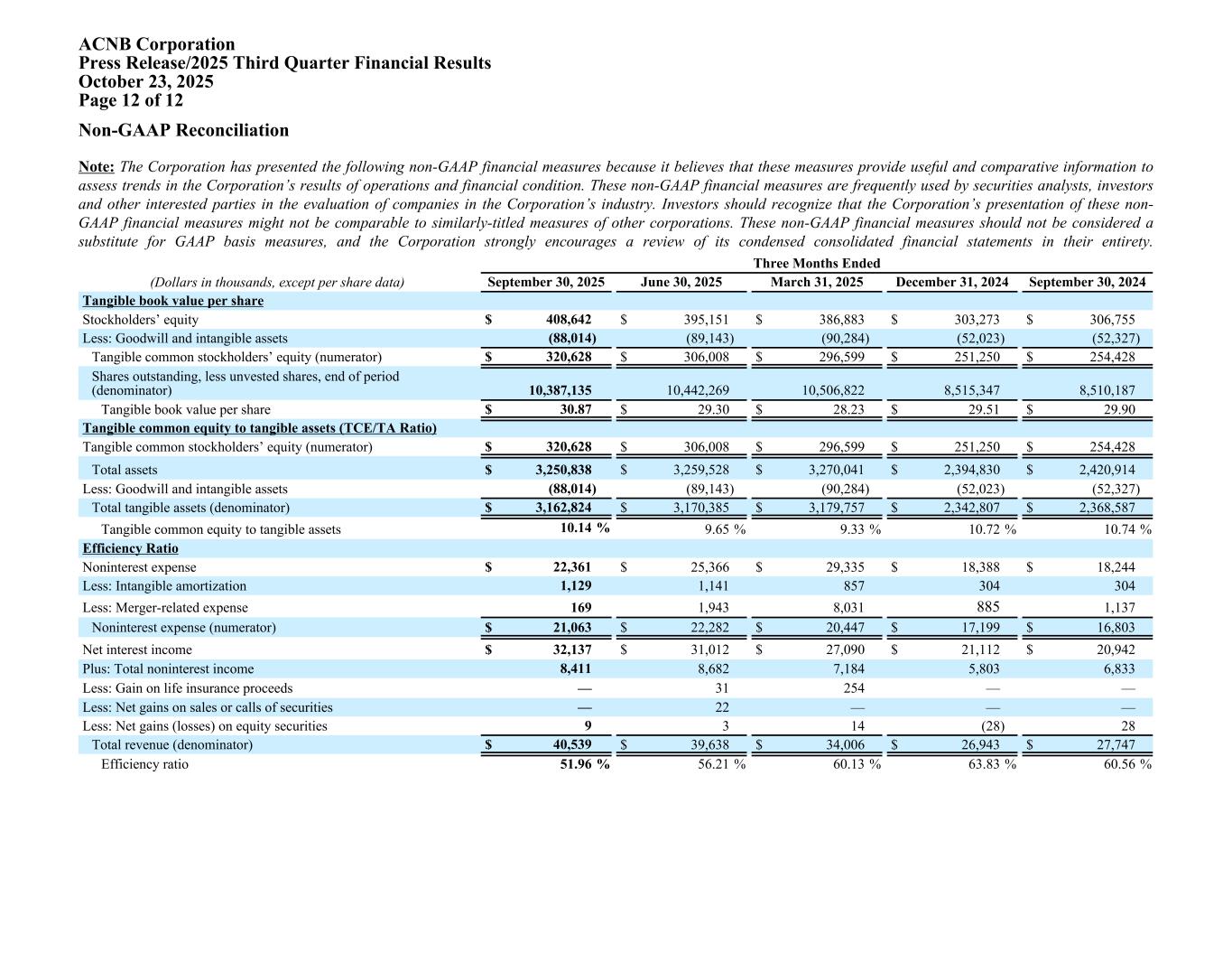 Non-GAAP Reconciliation Note: The Corporation has presented the following non-GAAP financial measures because it believes that these measures provide useful and comparative information to assess trends in the Corporation’s results of operations and financial condition. These non-GAAP financial measures are frequently used by securities analysts, investors and other interested parties in the evaluation of companies in the Corporation’s industry. Investors should recognize that the Corporation’s presentation of these non- GAAP financial measures might not be comparable to similarly-titled measures of other corporations. These non-GAAP financial measures should not be considered a substitute for GAAP basis measures, and the Corporation strongly encourages a review of its condensed consolidated financial statements in their entirety. Tangible book value per share Stockholders’ equity $ 408,642 $ 395,151 $ 386,883 $ 303,273 $ 306,755 Less: Goodwill and intangible assets (88,014) (89,143) (90,284) (52,023) (52,327) Tangible common stockholders’ equity (numerator) $ 320,628 $ 306,008 $ 296,599 $ 251,250 $ 254,428 Shares outstanding, less unvested shares, end of period (denominator) 10,387,135 10,442,269 10,506,822 8,515,347 8,510,187 Tangible book value per share $ 30.87 $ 29.30 $ 28.23 $ 29.51 $ 29.90 Tangible common equity to tangible assets (TCE/TA Ratio) Tangible common stockholders’ equity (numerator) $ 320,628 $ 306,008 $ 296,599 $ 251,250 $ 254,428 Total assets $ 3,250,838 $ 3,259,528 $ 3,270,041 $ 2,394,830 $ 2,420,914 Less: Goodwill and intangible assets (88,014) (89,143) (90,284) (52,023) (52,327) Total tangible assets (denominator) $ 3,162,824 $ 3,170,385 $ 3,179,757 $ 2,342,807 $ 2,368,587 Tangible common equity to tangible assets 10.14 % 9.65 % 9.33 % 10.72 % 10.74 % Efficiency Ratio Noninterest expense $ 22,361 $ 25,366 $ 29,335 $ 18,388 $ 18,244 Less: Intangible amortization 1,129 1,141 857 304 304 Less: Merger-related expense 169 1,943 8,031 885 1,137 Noninterest expense (numerator) $ 21,063 $ 22,282 $ 20,447 $ 17,199 $ 16,803 Net interest income $ 32,137 $ 31,012 $ 27,090 $ 21,112 $ 20,942 Plus: Total noninterest income 8,411 8,682 7,184 5,803 6,833 Less: Gain on life insurance proceeds — 31 254 — — Less: Net gains on sales or calls of securities — 22 — — — Less: Net gains (losses) on equity securities 9 3 14 (28) 28 Total revenue (denominator) $ 40,539 $ 39,638 $ 34,006 $ 26,943 $ 27,747 Efficiency ratio 51.96 % 56.21 % 60.13 % 63.83 % 60.56 % Three Months Ended (Dollars in thousands, except per share data) September 30, 2025 June 30, 2025 March 31, 2025 December 31, 2024 September 30, 2024 ACNB Corporation Press Release/2025 Third Quarter Financial Results October 23, 2025 Page 12 of 12
